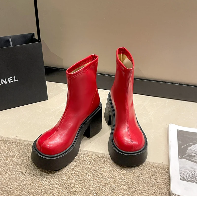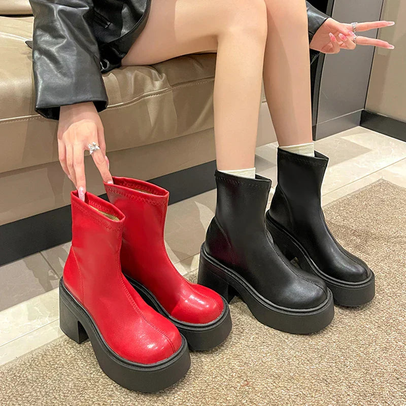 IFOMT - Punk Style Women Ankle Boots Fashion Round Toe Slip On Shoes Autumn Winter Thick High Heel Ladies Knight Short Booties