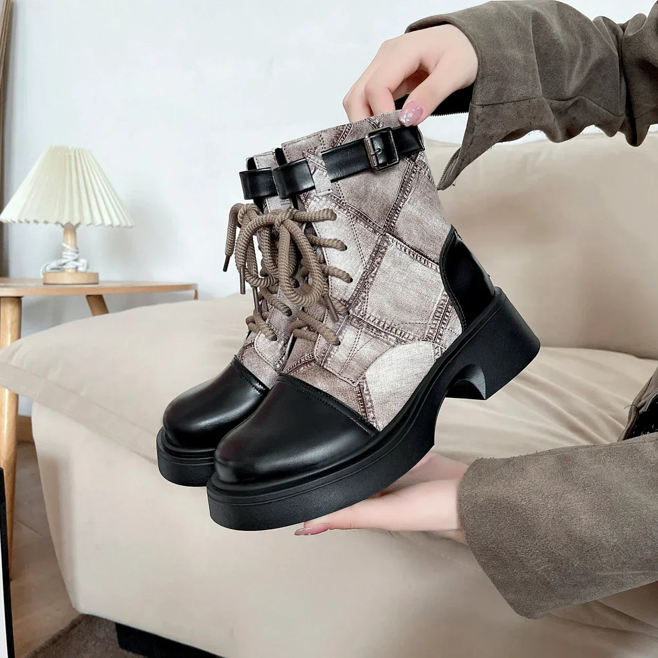 IFOMT - Women's Shoes on Sale Fashion Lace Up Women's Boots Autumn Round Toe Mixed Colors Short Barrel Chunky Heels Ladies Boots