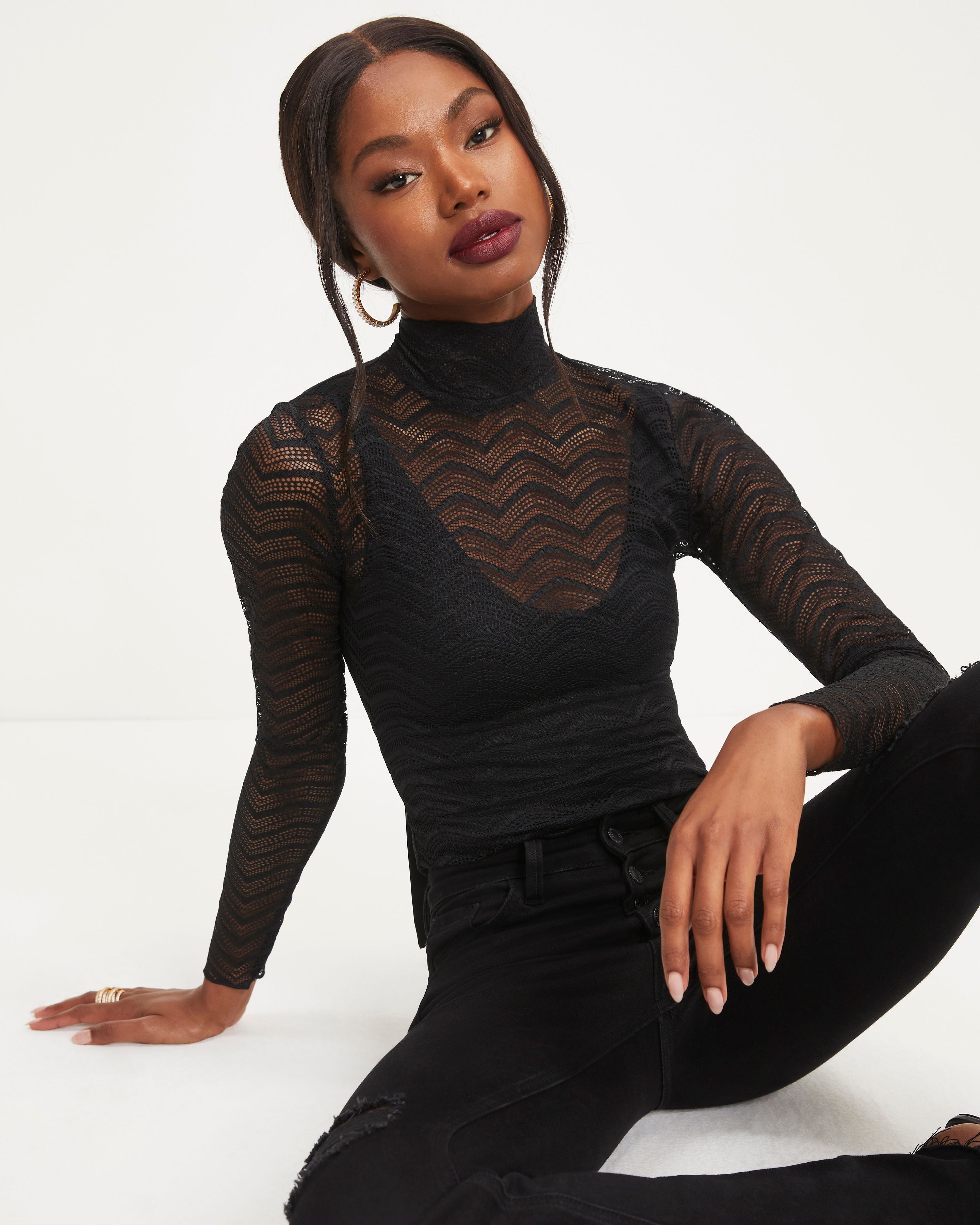 Romance meets sultriness in the Annabella Crochet Lace Mock Neck Bodysuit in black that features a high neckline.
