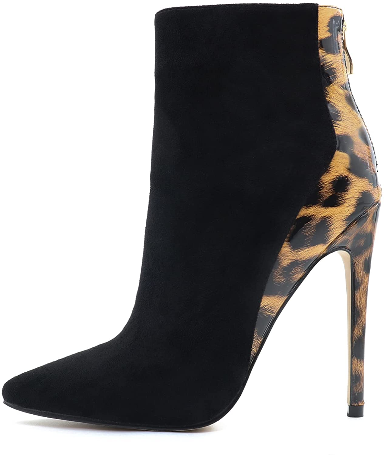 Black Leopard Ankle Boots Closed Pointed Toe Stilettos