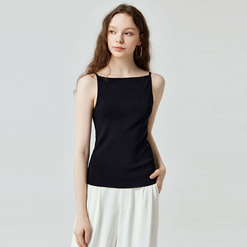 Simple yet elevated. the basic top is the essential staple in your wardrobe the whole year round. Perfect for the summer and those layering moments. the knit top is constructed from a mixture of viscose and nylon for a soft breathing touch. Featuring a demure high square-neckline flattering your decolletage. the basic black one has spaghetti straps and a lower back design to show forward some skin in the sun-soaked summer. Wear it on its own for a minimalist look or layered with a shirt for a simple elevated style.