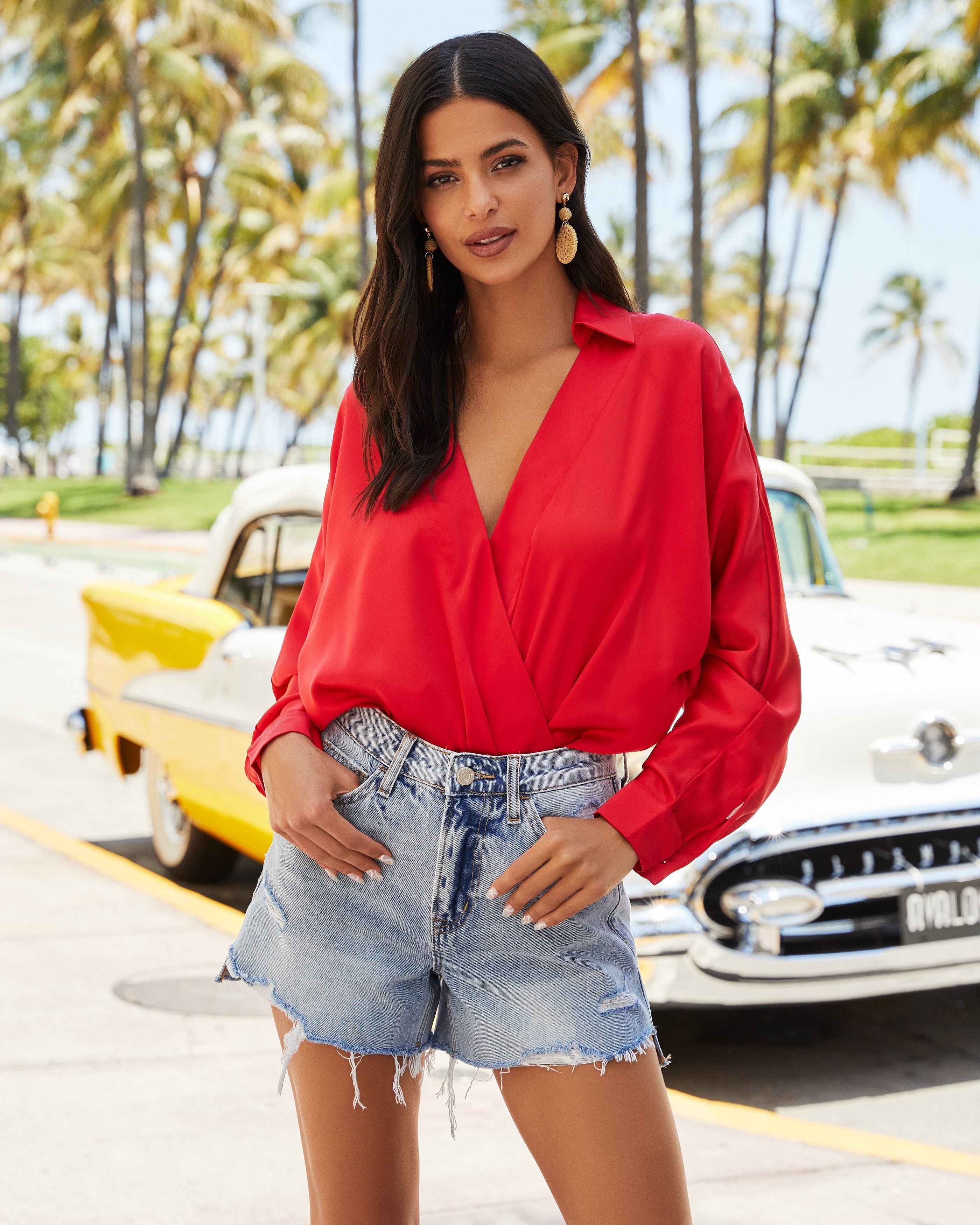 Look chic in the city in the Bentley Biz Satin Long Sleeve Bodysuit in redfeatures a draped neckline.