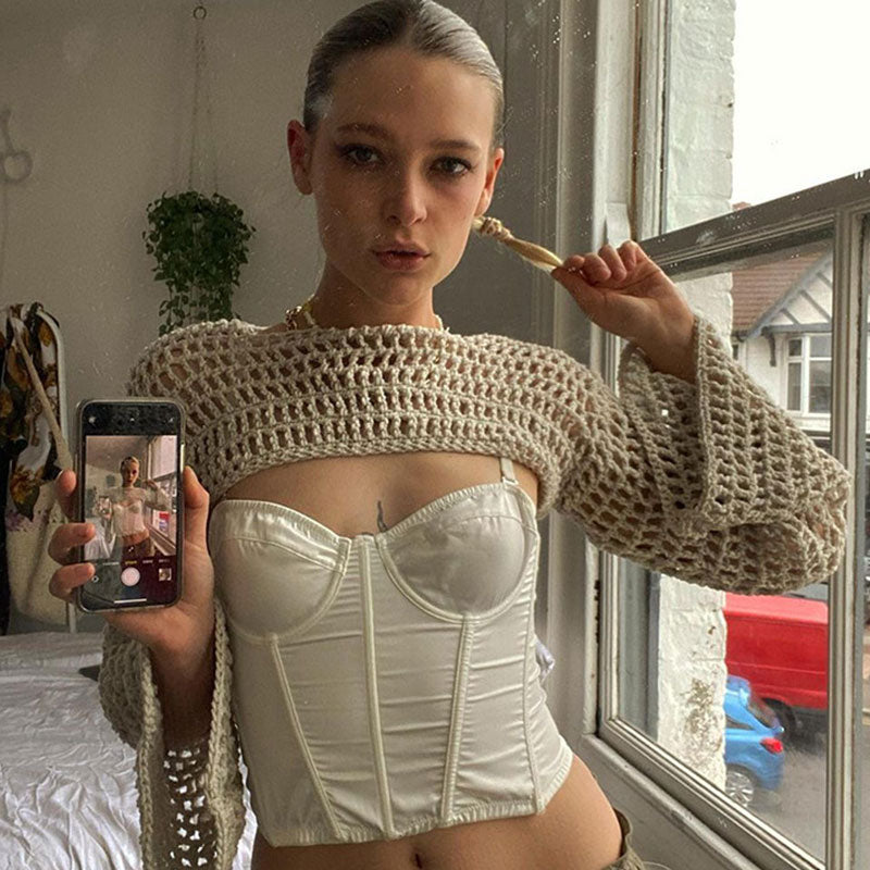 Made for summer: breezy crochet shrugs! This trendy and stylish knit top effortlessly captures the essence of bohemian vibes with its captivating crew neck and flowing bell sleeves. The intricate open knitting crochet design adds a distinctive and textural element. creating a truly on-trend and eye-catching look. The cropped length perfectly complements high-waisted bottoms. allowing you to create stylish and flattering ensembles. Embrace the free-spirited boho spirit and elevate your outfit with this effortlessly chic knitted pullover.