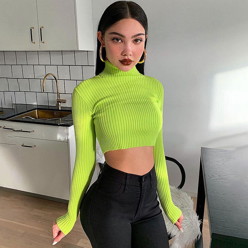 We must say that neon green. the must-try color in this season. Bound to catch eyes at the first sight. this highlighter-green top is cut off at the cropped length and has a touch of softness and smoothness as it's fashioned from a blend of acrylic and nylon for an instant tight fit. The knit sweater has all the cold weather-ready credentials including the chic turtleneck and the fitted long sleeves. Go all tight with black pants if you want a more fashion look.
