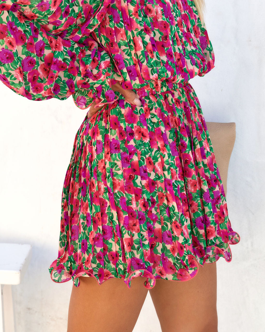 Go for a femme look in the Bougainvillea Floral Pleated Mini Skirt in magenta florals that features an elastic waistband.