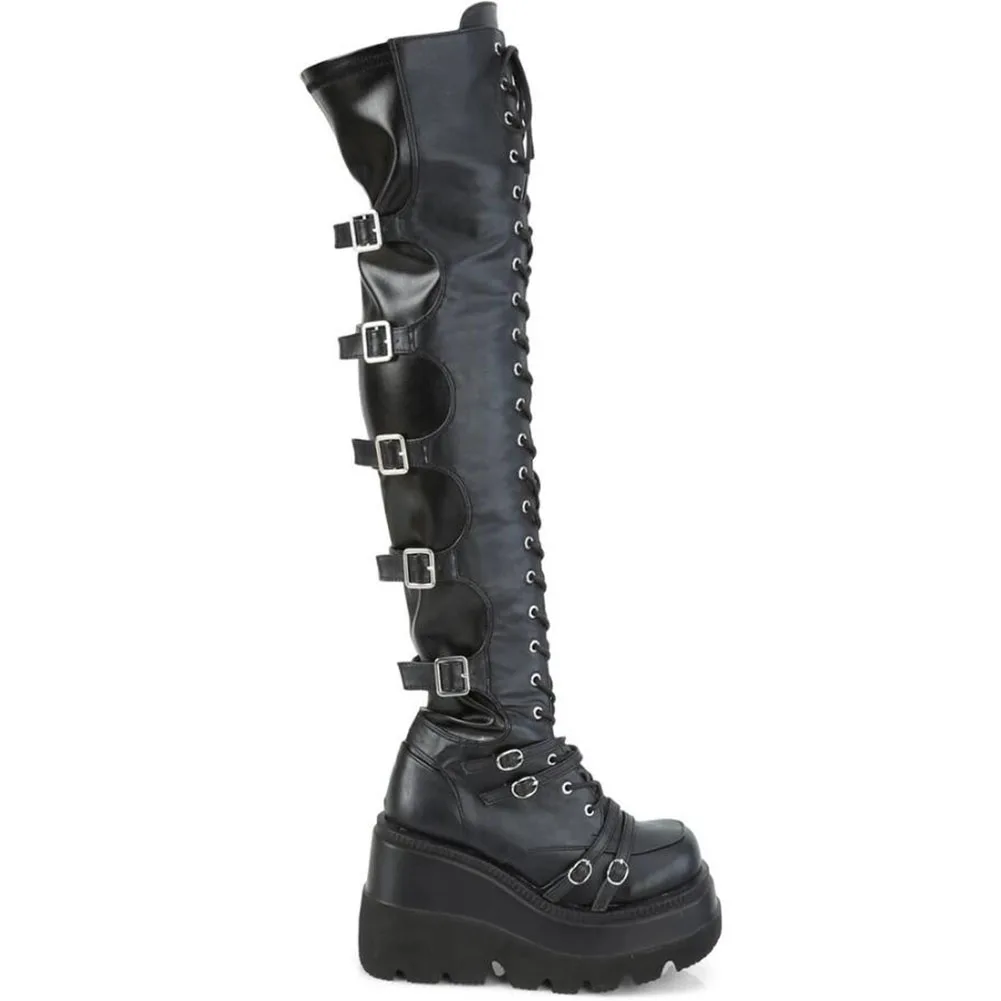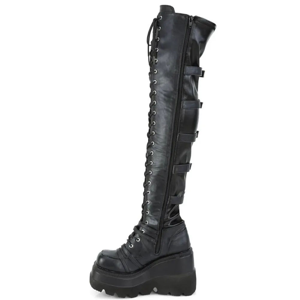 Brand Design Female High Platform Thigh High Boots Buckle Strap Gothic Girls High Heels Boots Women Cosplay Wedges Shoes