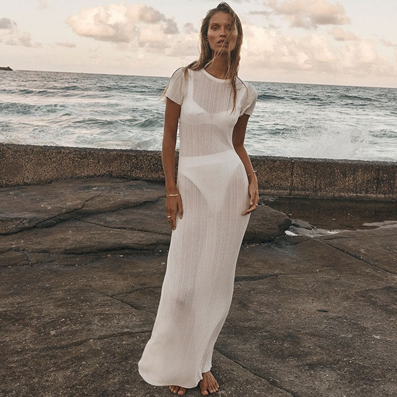 This breezy gauzy-knit maxi dress is more wearable but just as cool as you image! The rib sheer dress features a slip-on crew neckline and short sleeves. providing comfort and ease of wear. Its figure-hugging silhouette gracefully flows into a floor-length hemline. creating a stunning and elegant appeal. Available in two classic colors. black and white. this cover-up dress is a must-have for those seeking effortless style and versatility in their wardrobe. Dress up as a cover-up outfit or layer it with a slip dress for a street-style look.