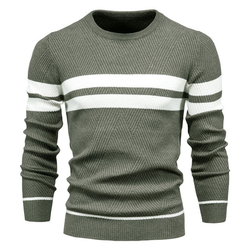Win in style with our casual knitted jumper. This embodiment of men's knitwear trends combines an acrylic and cotton blend with a striking contrast stripe print and captivating textural ribbed pattern. The pullover design. paired with long sleeves. achieves a lust-worthy blend of fashion and comfort. Weighing just 0.88 lbs. it guarantees warmth and coziness during brisk fall days. Its classic fit effortlessly bridges the gap between casual and refined. making it an ideal match for blazers. shirts. tailored trousers. or slim-fit jeans.