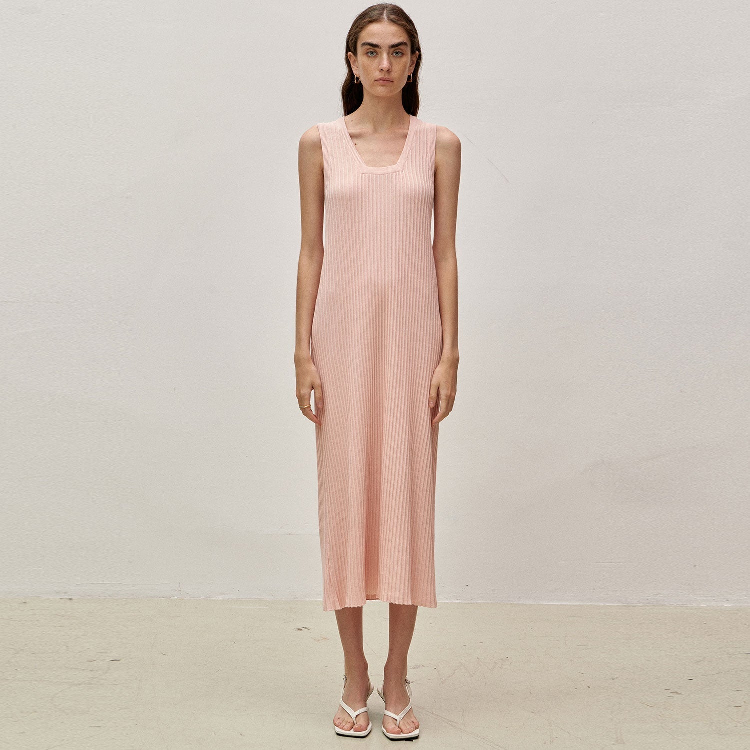 With an A-line shape. our spring and summer sundress epitomizes effortless chic and casual elegance. Available in White. Black. and Pink. this sleeveless knit dress features a unique square neck and chunky ribbed knit. harmonizing comfort with style. Its tank silhouette and tea-length design make it a perfect choice for warmer seasons. offering both ease and sophistication. Crafted from a blend of acrylic and cotton. this knitted dress ensures breathability and versatility. becoming an essential piece for effortlessly chic and easy-to-wear fashion throughout the spring and summer.
