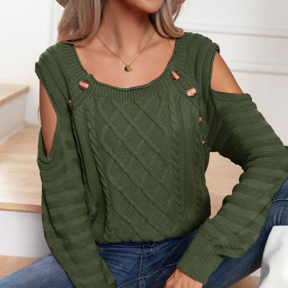 Give a little feminine style to your winter sweater. This fisherman jumper is crafted with soft acrylic yarns and features unique cable textures with the skin-revealing shoulder cutouts. which is a smart combination of femininity and nostalgia. The buttons are dotted on the front. making it a perfect choice to be worn alone. adding more detail to your autumn knitwear fashion. Keep it simple and casual with denim jeans.