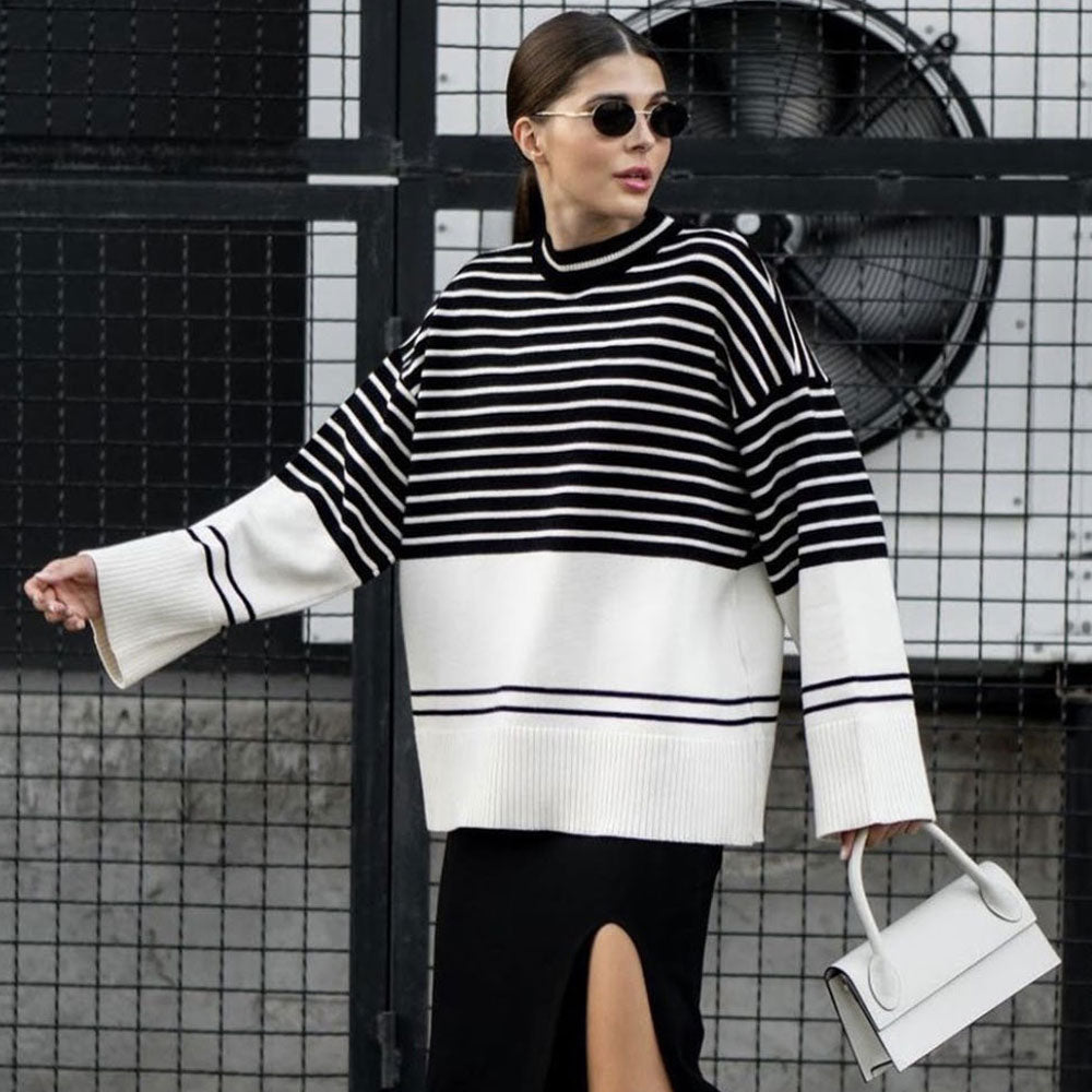 A striped sweater is even more nonchalant cool than others. This high-neck is no different. The blended knit is made from a mixture of acrylic. polyester and elastane for a smooth and comfortable handle. Patterned with half-and-half contrasting hues and iconic striped print. this pullover sweater will lend you a relaxed silhouette with the slouchy dropped shoulders and long sleeves. Keep the look feminine by pairing the striped sweater with a monochrome skirt thing. Simple. comfy but still put-together!