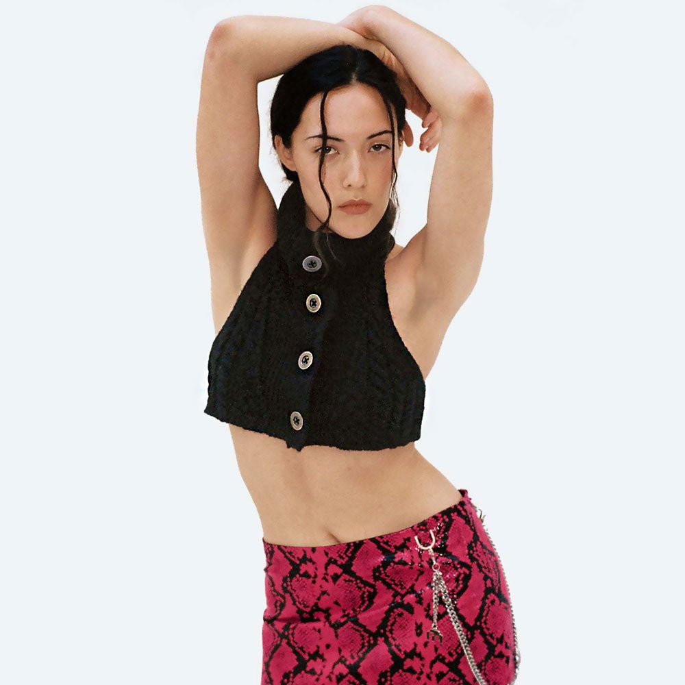 Get groovy in this sleeveless cardigan. Inspired by the retro cable pattern that combines the ribbing detail to the front. this turtleneck cardigan boasts a buttoned placket cropping right under the bust. The acrylic knit fabric adds softness making it wearable against your skin. Serve it-girl looks by styling it with a mini skirt and sleek boots. Add a leather trench coat for a more winter-appropriate outfit.