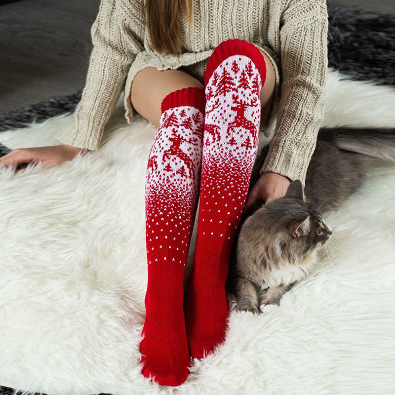 Warm holiday feeling overwhelms these Christmas socks as they use refined knitting fabric of acrylic-blend to create a lofty. soft and comfortable feel. Patterned with reindeer and snowflake for a Christmas-y feel. the socks are measured approximately 24 inches long to hit at the thigh keeping your leg a toasty warm. Pair them with your favorite mini skirt and Mary Jane shoes for a joyous festive touch.