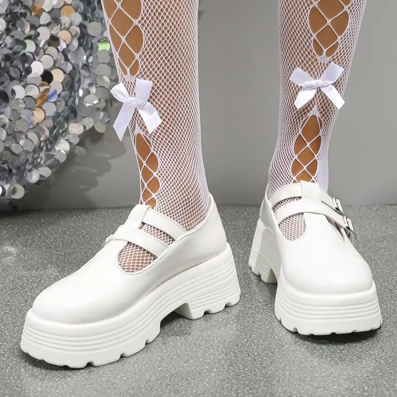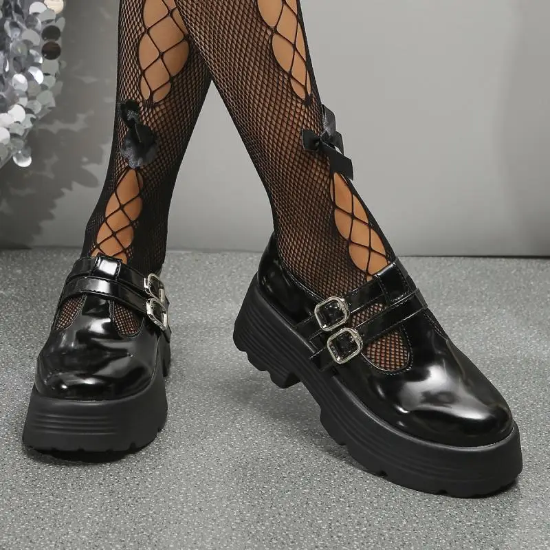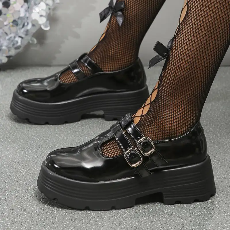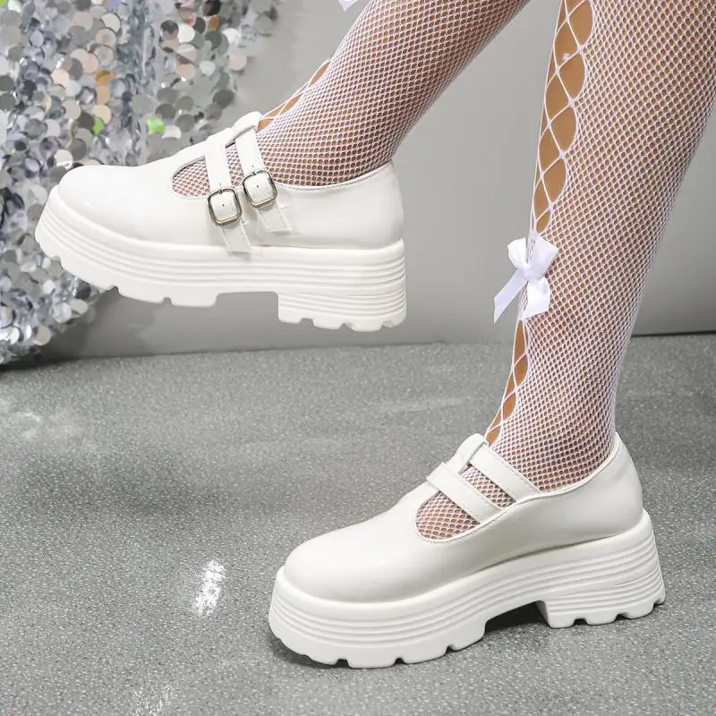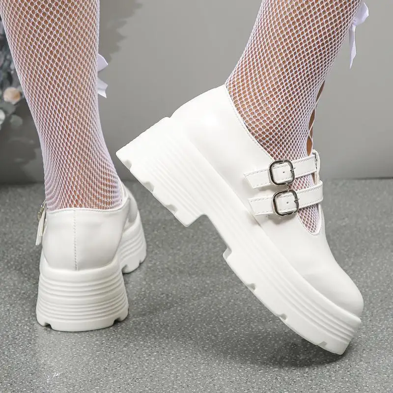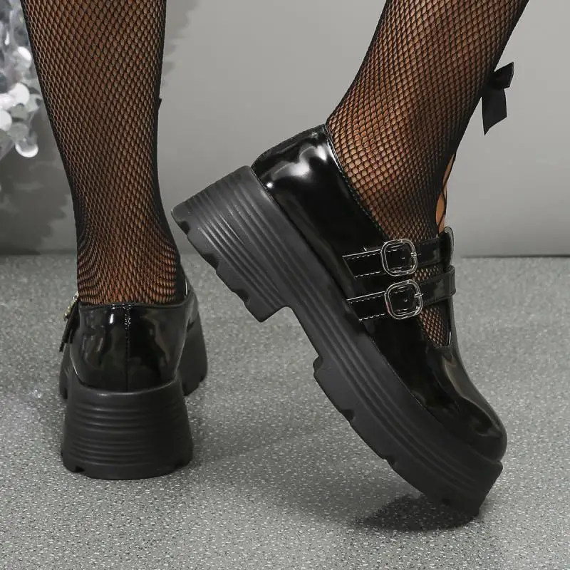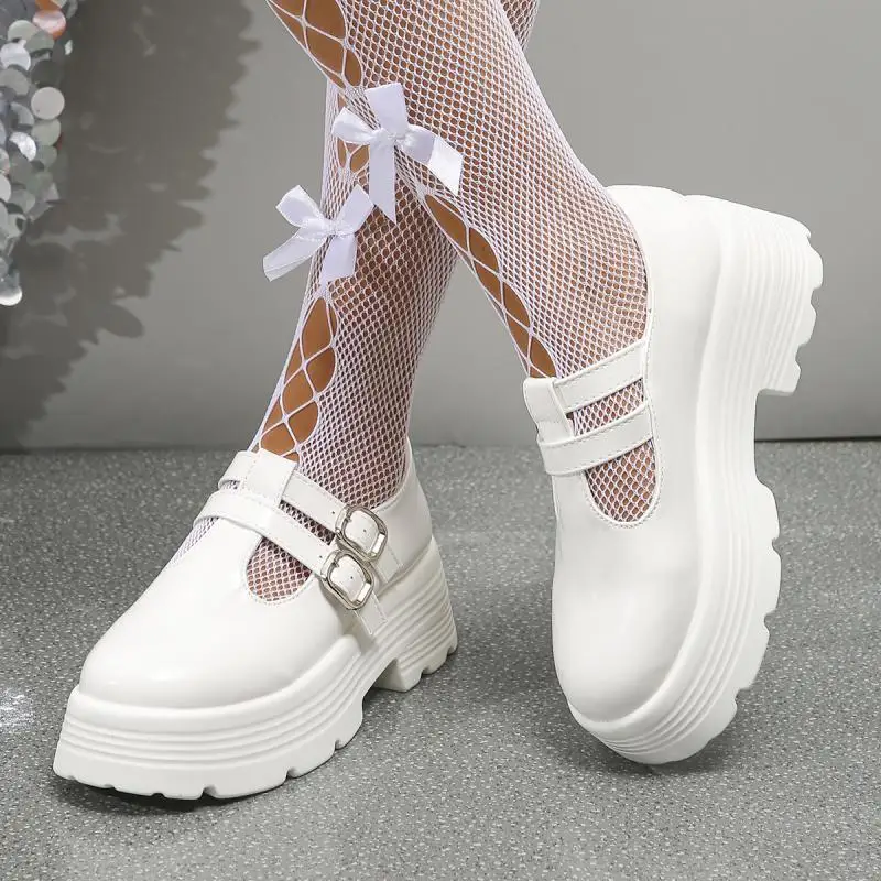 Chunky Platform Mary Jane Shoes Women Patent Leather Double Buckle Strap Pumps Woman Black White Thick High Heels Lolita Shoes