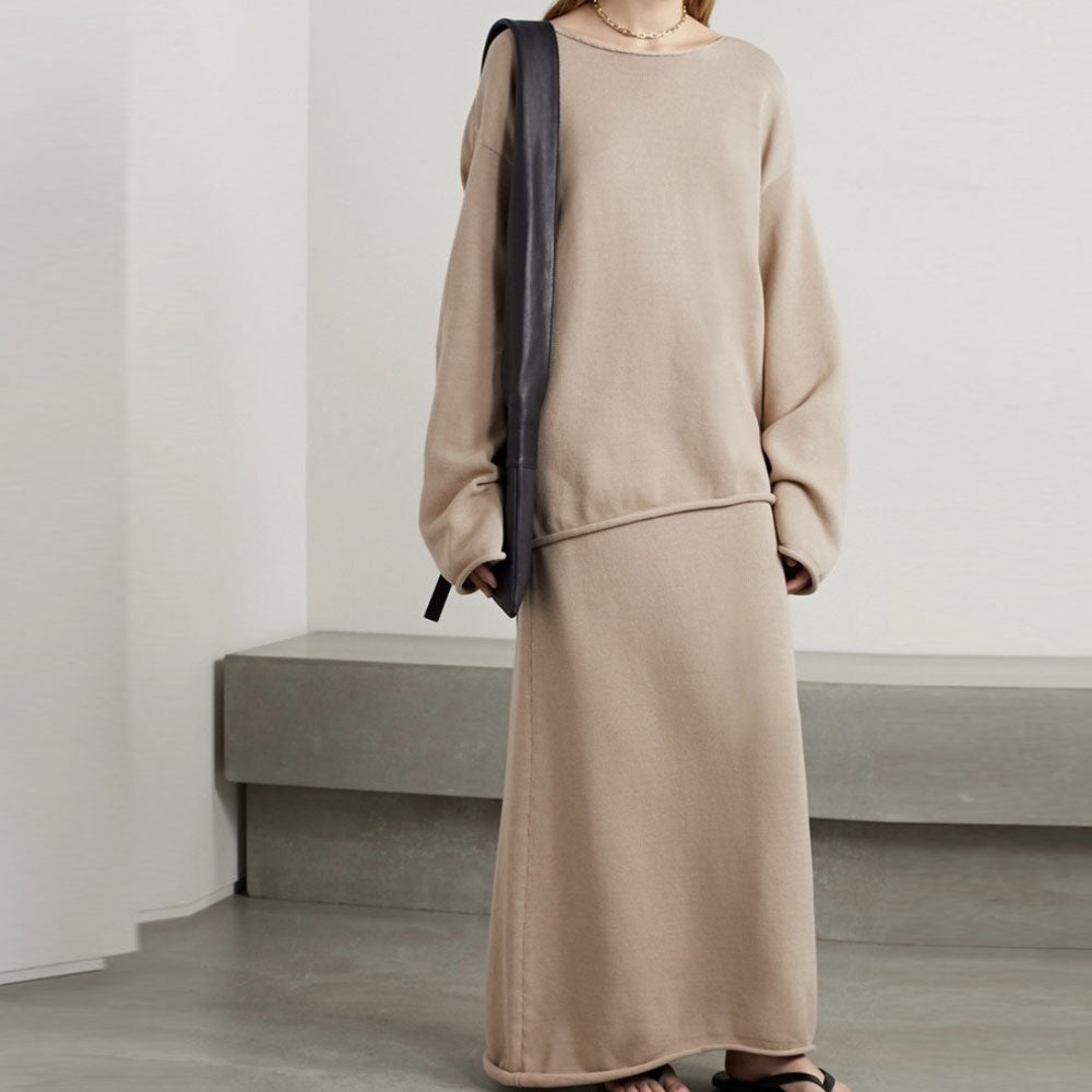 This is the knit skirt for the sweater lover who's looking to invest in something classic and elevated. This high-rise knit skirt is the perfect complement to your wardrobe. designed with a focus on refinement and versatility. Crafted from a premium cotton blend. it combines comfort with a touch of luxury. ensuring you stay stylish and comfortable all day long. The rolled trim adds a chic. fashionable detail. enhancing the overall look of the skirt. With its straight. midaxi design. this knitted long skirt is perfect for various occasions. effortlessly pairing with the matching roll-trim pullover.