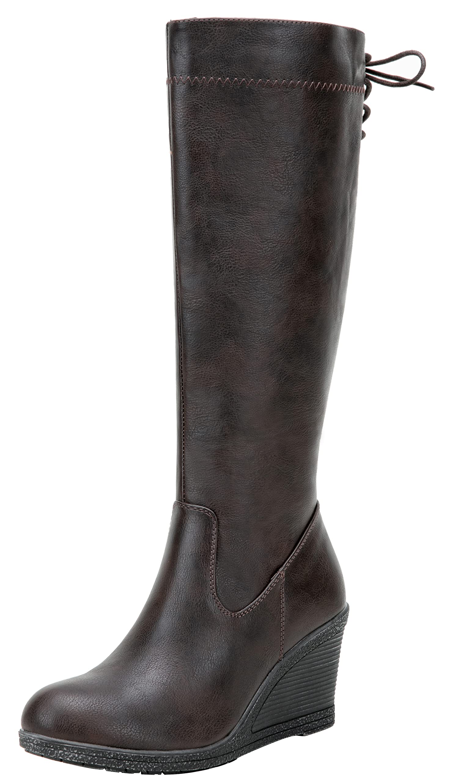 Be stylish and comfortable even in cold weather with these Winter Fab Knee High Wedge Boots. Crafted with premium faux leather. warm lining and a durable sole. these boots trade warmth for fashion while providing optimal foot support. They come with a stylish wedge heel and have a comfortable fit that will last all winter long.