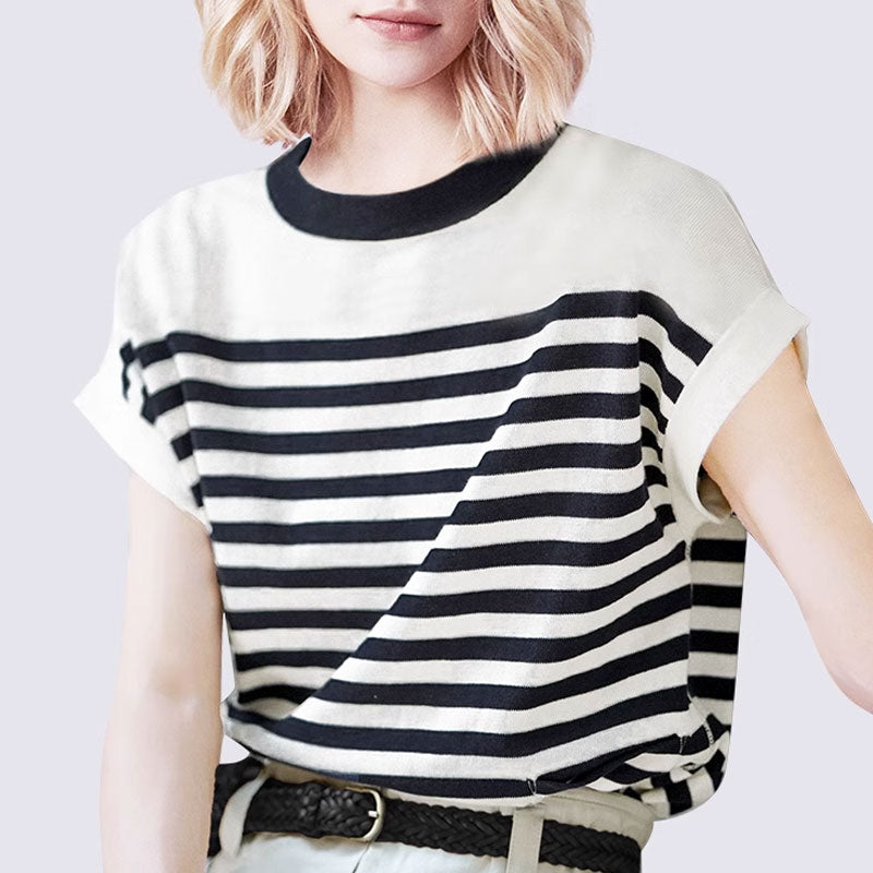 Embrace timeless elegance with our pretty style striped sweater. This versatile pullover sweater is a must-have for your summer wardrobe. With its chic round neck and short sleeves. it exudes effortless style while keeping you cool on warm days. The black and white stripes add a touch of sophistication. making it perfect for any occasion. Crafted from lightweight knit fabric. it ensures both comfort and fashion-forward appeal. Elevate your summer look with this timeless and chic striped knit sweater.
