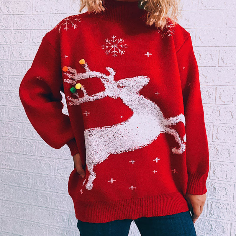 This textured reindeer sweater with a pom-pom statement is a Christmas fashion no-brainer. Made from mid-weight acrylic and cotton. this holiday jumper is intarsia-knitted with snowflake and cross patterns. has ribbed details adding emphasis to the mock neckline. dropped-shoulder long sleeves and the hem. and a relaxed silhouette adds a touch of baggy look. This red pullover knit plus a sequined skirt and your favorite pair of knee-high boots equals the ideal Xmas party fit.