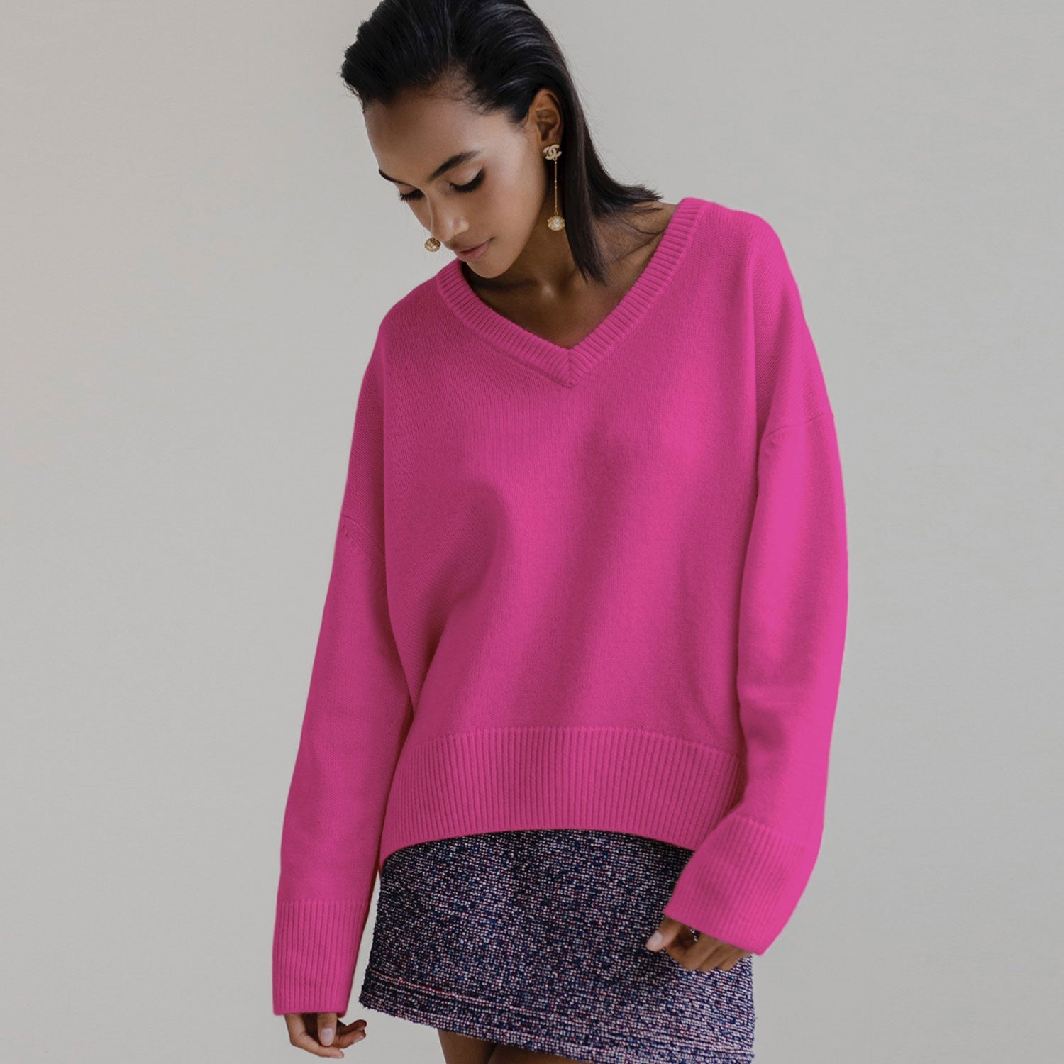 Giving you the most enjoyable experience through the winter season. our pullover jumper is crafted with a blend of viscose to lend you a comfortable soft touch against your skin. Available in a variety of shades or flatter you skin tone. the sweater is cut in an oversized silhouette. featuring a classic V neck. long sleeves and drop shoulder design. to offer you a loose fitting. which keeps you warm yet still feeling minimalist in style. The ribbed trims on the neckline. cuffs and hemline offers some sort of stretch that's really elongating for you to wear the years to come. Stay low key in fashion. and style it with a pair of white jeans and sneakers. Last but not least. we advise you put a classic belt to accentuate the waist.