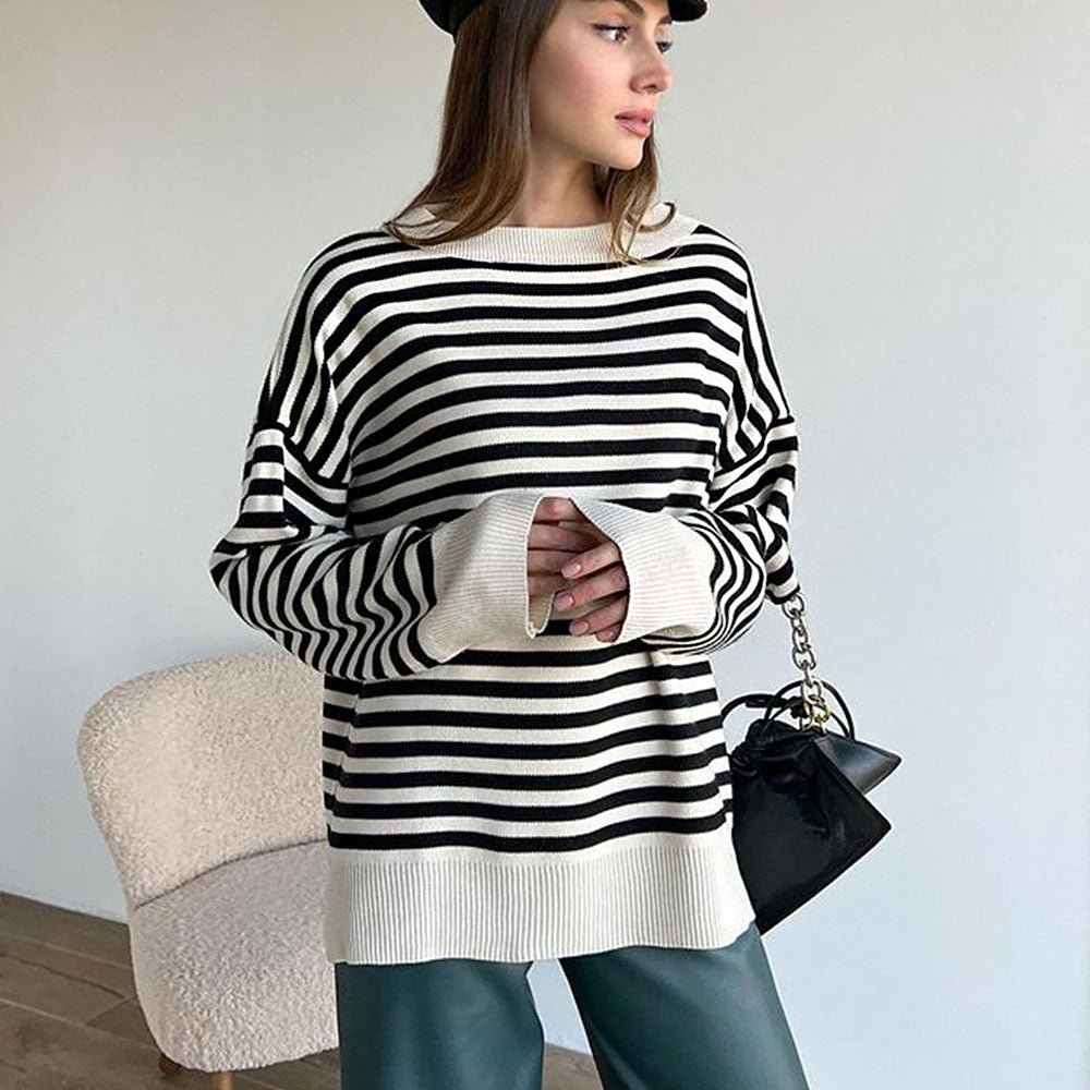 Keep going with the coastal-grandmother-inspired trend in our stripe sweater collection. Styled with a relaxed drop-shoulder silhouette. this sweater is designed in an oversized fit and patterned with contrasting stripes which is truly a modern essential. With an easy pulling-on style. it's trimmed with subtle ribbing at the crew neck. loose cuffs and vented hem. It's particularly made from a blend of polyester and elastane for a superb smoothness and comfy feel. Wear yours with half-tucked into jeans or tailoring for an effortless-chic look.