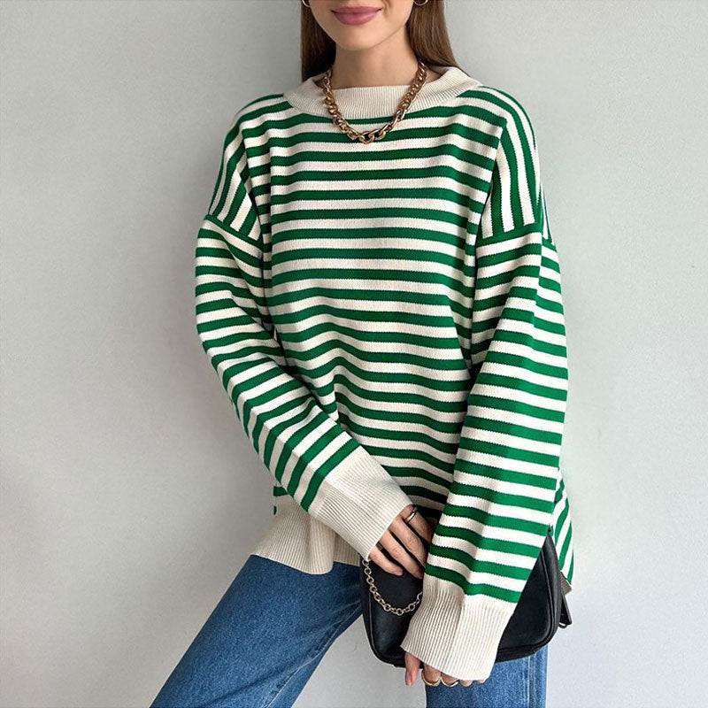 Keep going with the coastal-grandmother-inspired trend in our stripe sweater collection. Styled with a relaxed drop-shoulder silhouette. this sweater is designed in an oversized fit and patterned with contrasting stripes which is truly a modern essential. With an easy pulling-on style. it's trimmed with subtle ribbing at the crew neck. loose cuffs and vented hem. It's particularly made from a blend of polyester and elastane for a superb smoothness and comfy feel. Wear yours with half-tucked into jeans or tailoring for an effortless-chic look.