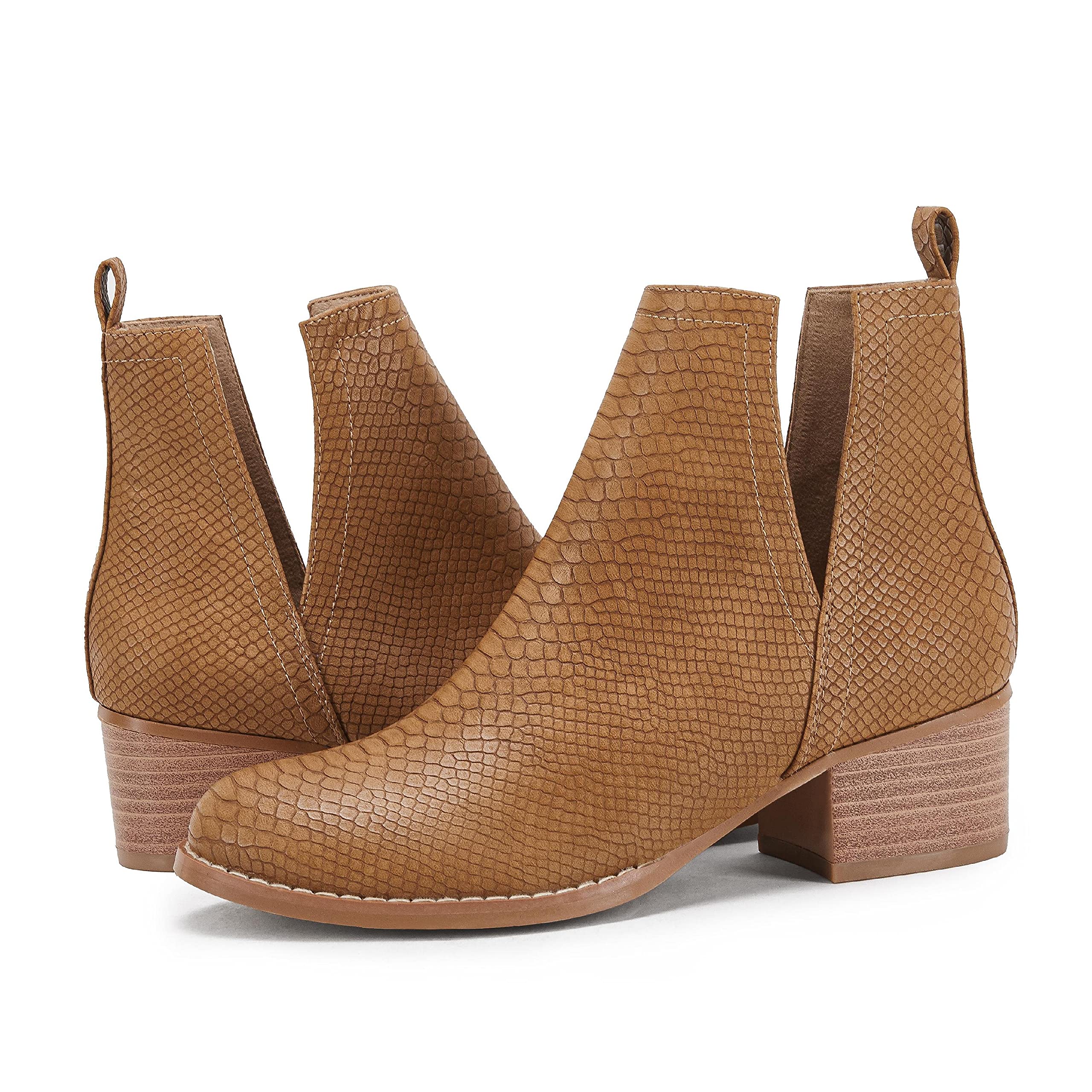 • FEATURES - ankle booties for women. chunky stacked heel. cute almond toe. side deep v cutout. back pull-tab. hollow out. faux leather. snake print and solid color