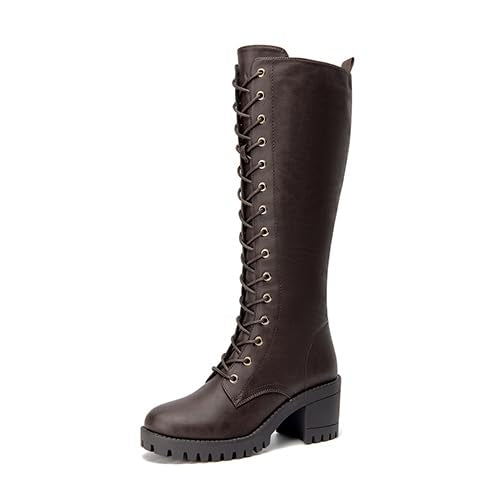 Make a fashion statement in these stylish Chunky Lace Up Knee High Boots. With their sturdy leather construction. wide laces. and comfortable lining. these boots offer maximum comfort and style. The chunky sole provides extra cushioning and impact protection for long-term wear.