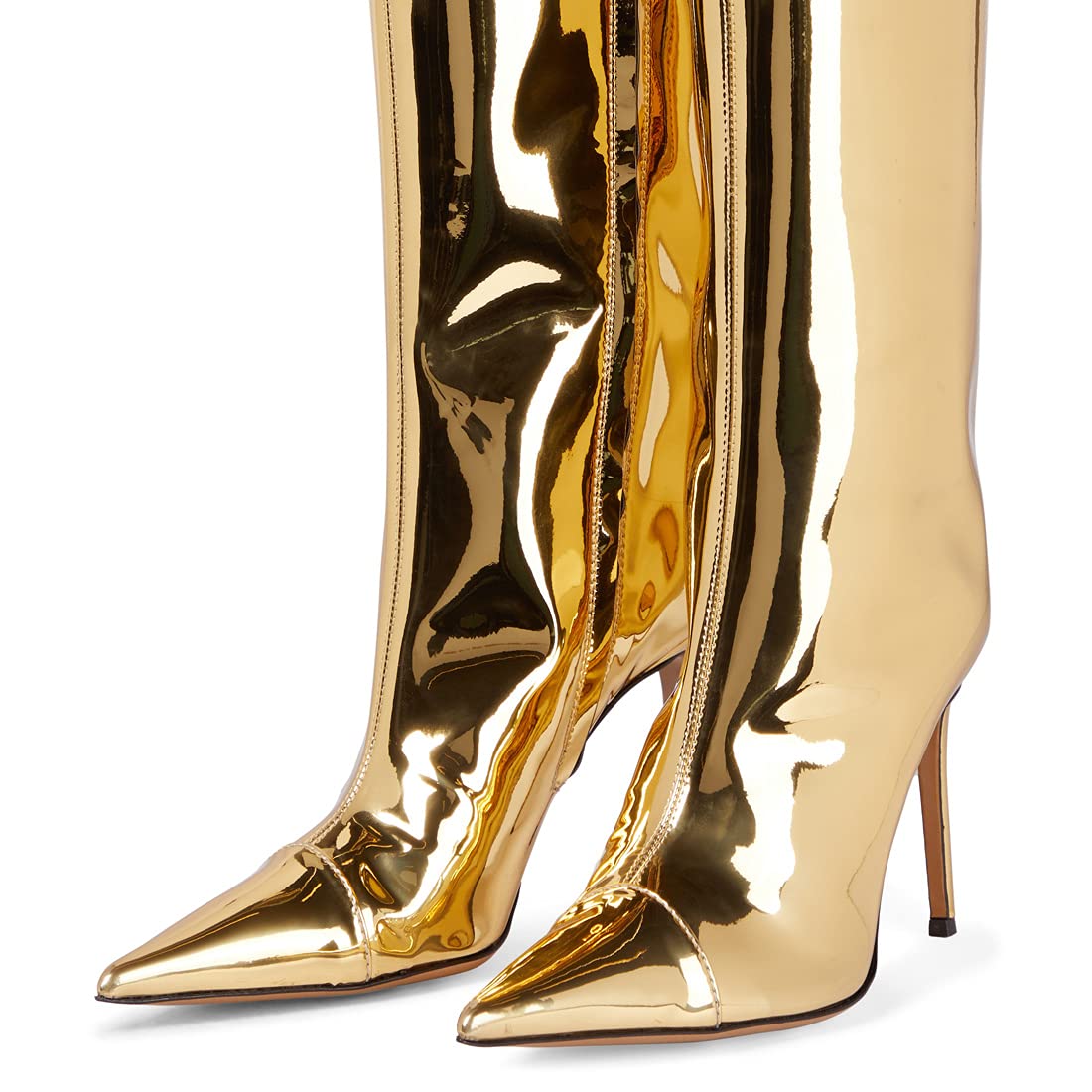 These Fashion Forward Metallic Knee High Stiletto Boots offer eye-catching style with their luxurious metallic exterior. The supportive stiletto heel and back zipper make them comfortable and easy to wear. making them an ideal choice for days spent out of the house.
