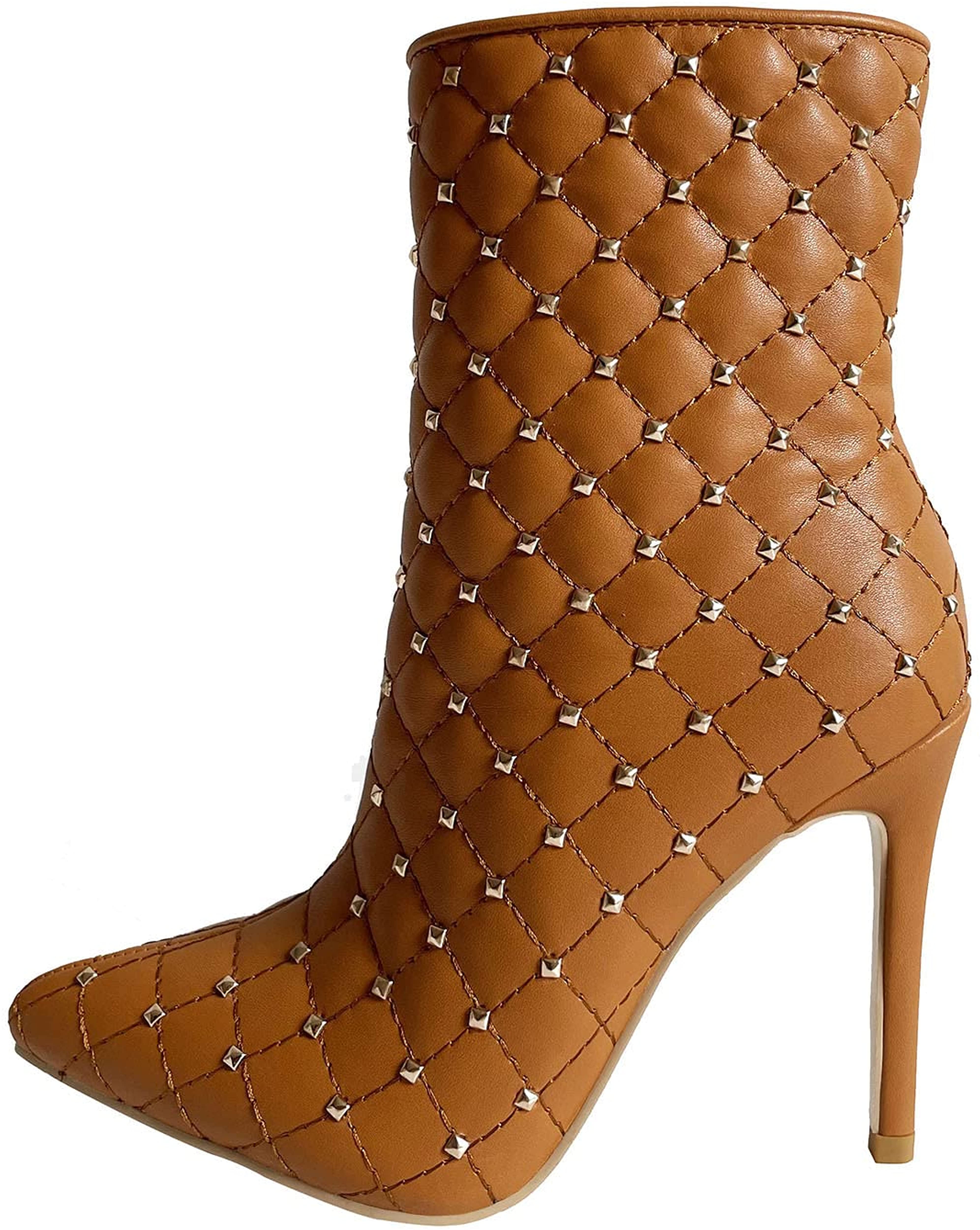 Comfy Brown Pointed Toe Stilleto Side Zipper Booties with Gold Studs