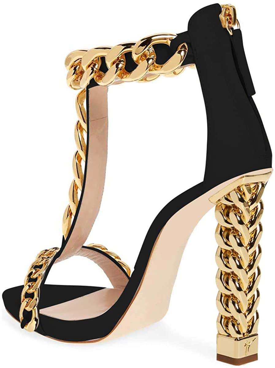 T-Strap Black Metal Chain Ankle Strap Chunky High Heel Sandals