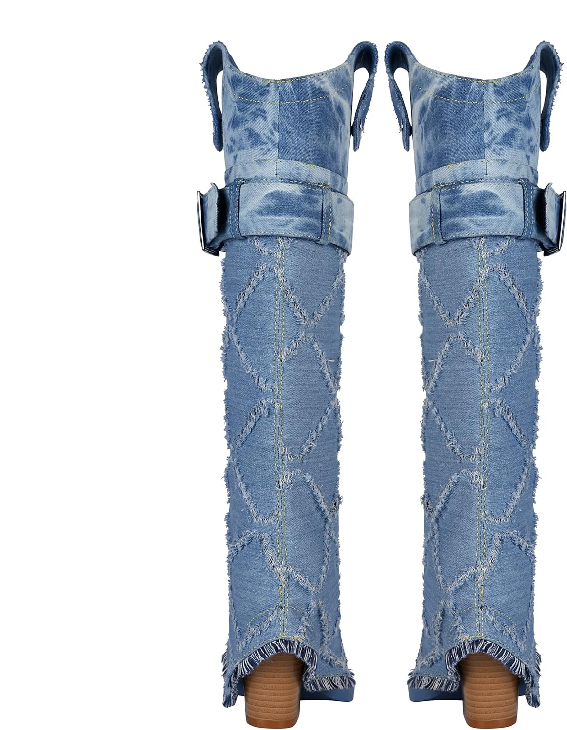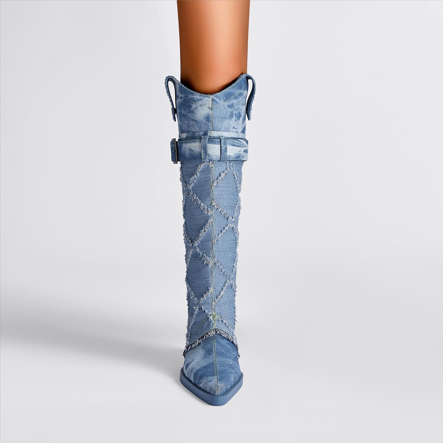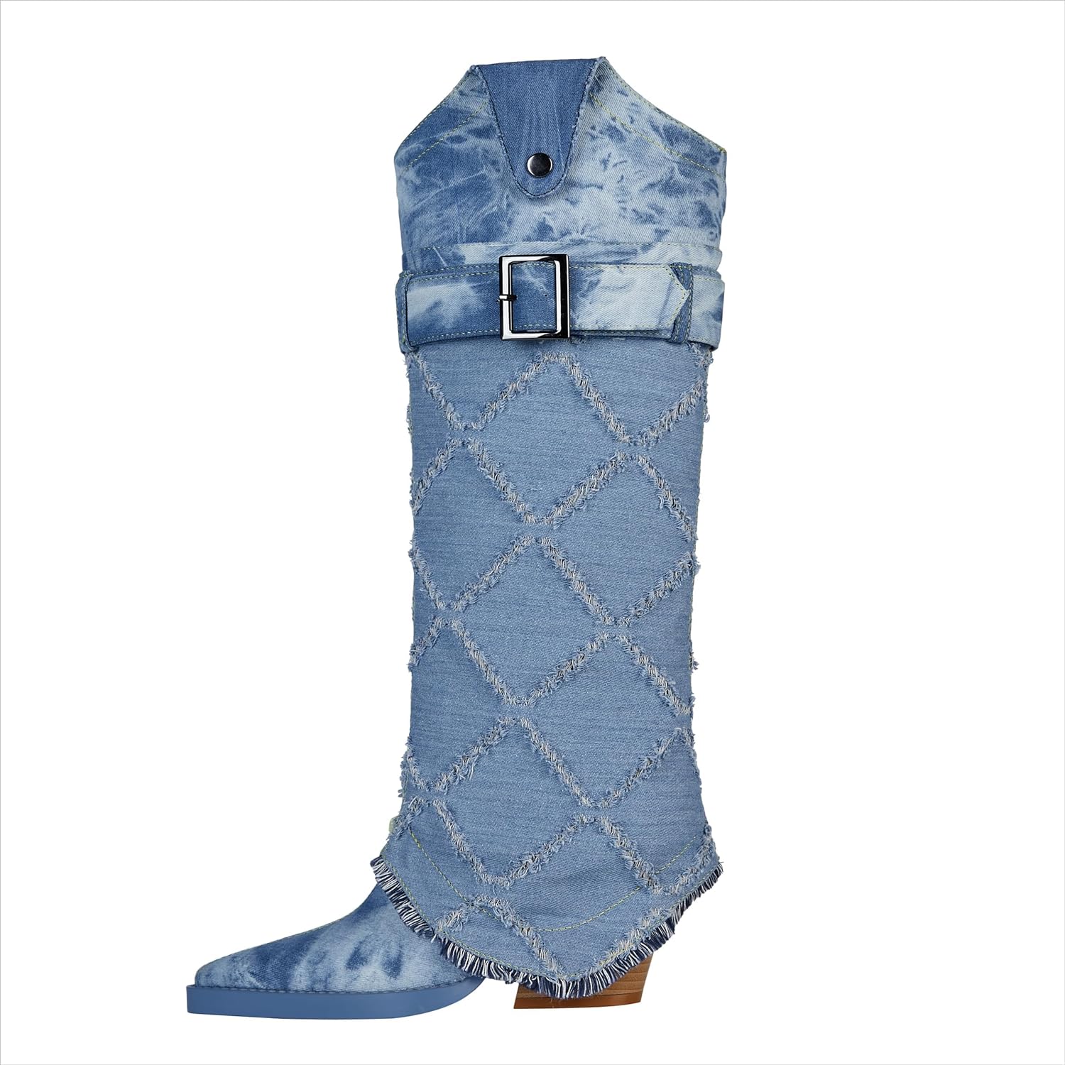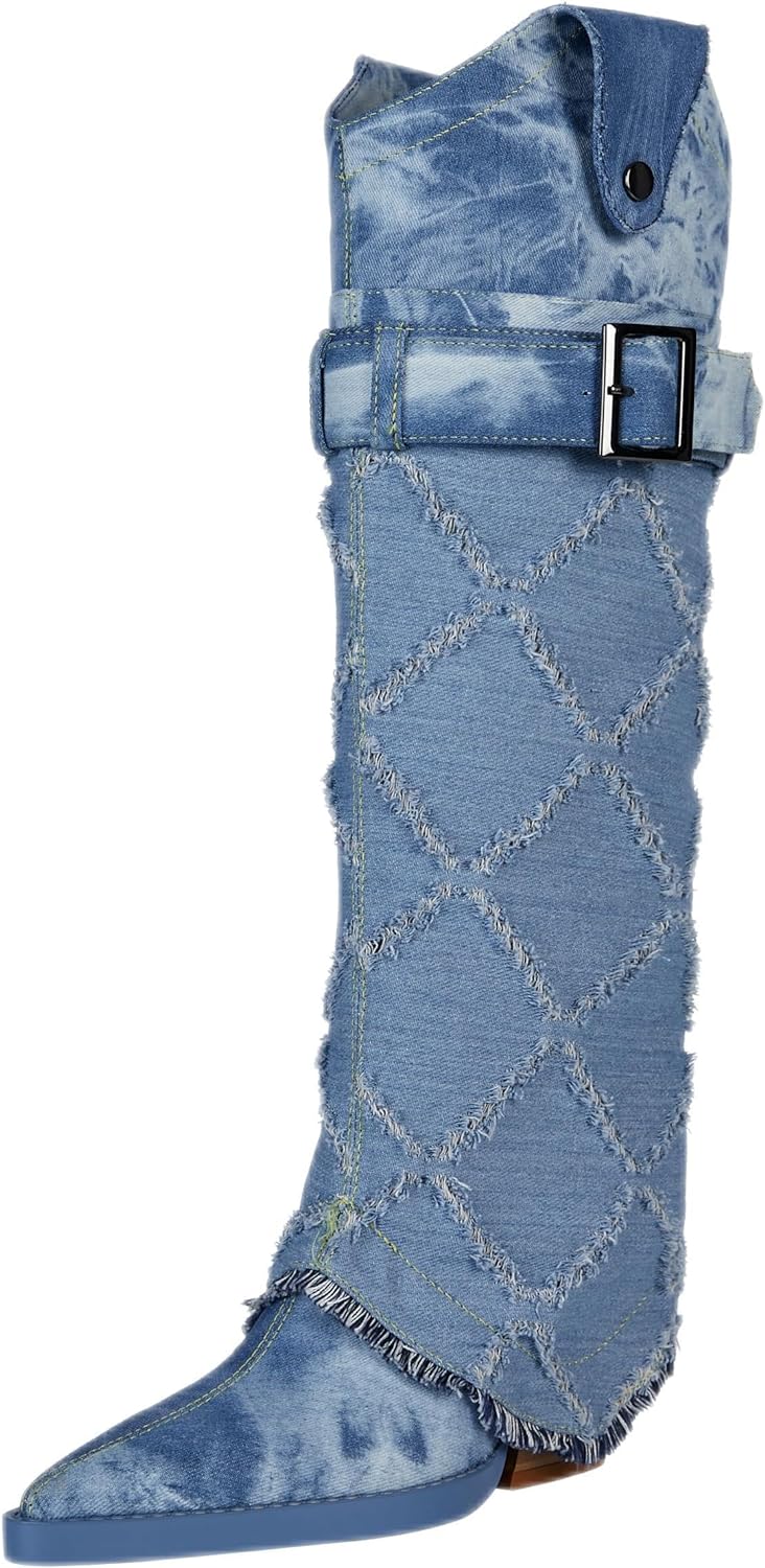 These Diamond Textured Blue Denim Knee High Cowboy Boots are crafted from high-quality materials and feature diamond-textured stitching to keep them looking stylish. Their knee-high length ensures extra comfort and support. while the cowboy-style design adds a unique touch. Enjoy quality and style with these long-lasting boots.