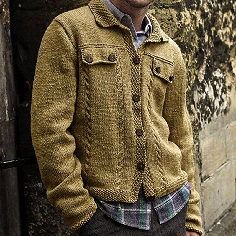 Low-key fashion is the other name of this men's knit. Crafted with solid recycled yarns to create a unique cable stitching for your vintage taste. this casual cardigan sweater is cut loose in its silhouette. featuring a row of buttons to the front. fold-over collar and textured knitted hemline to fits you perfectly. Ideal to layer over your collared or collarless shirts. this cardigan knitwear is super versatile and easy to wear during this sweater weather and will never leave off your shoulder. Take cues from the picture and style with cargo pants. plaid shirts underneath.