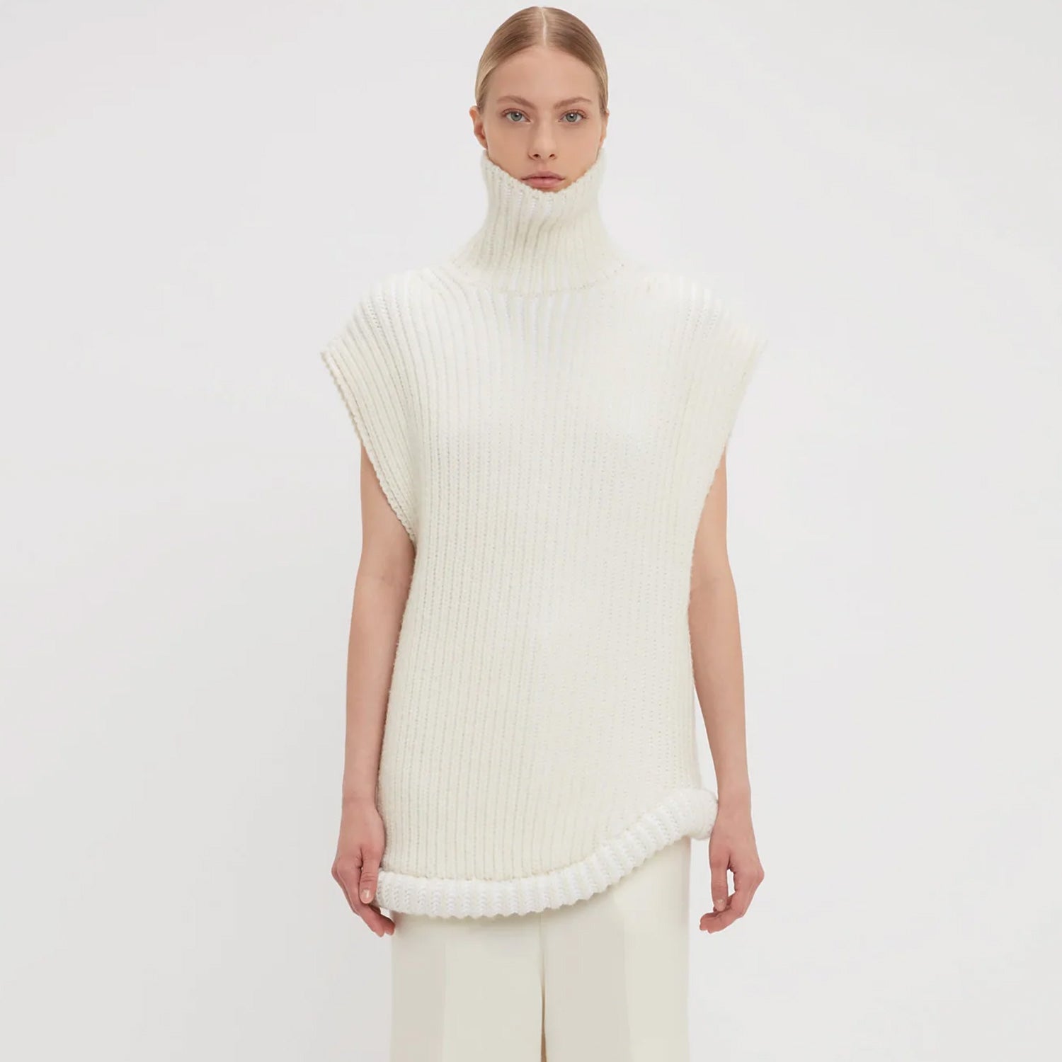 Express your minimalist style in an elegant way with this quiet luxury sleeveless top. It is designed with clean lines and a sophisticated high neckline. The drop shoulder feature adds a relaxed and comfortable fit. while the turnover hem gives it a distinctive look. This chunky ribbed knit pullover is versatile. doubling as a longline sweater vest. perfect for layering over your favorite blouses or under jackets. Embrace the simplicity and timelessness of this oversized knitwear. which effortlessly combines modern style with classic elements.