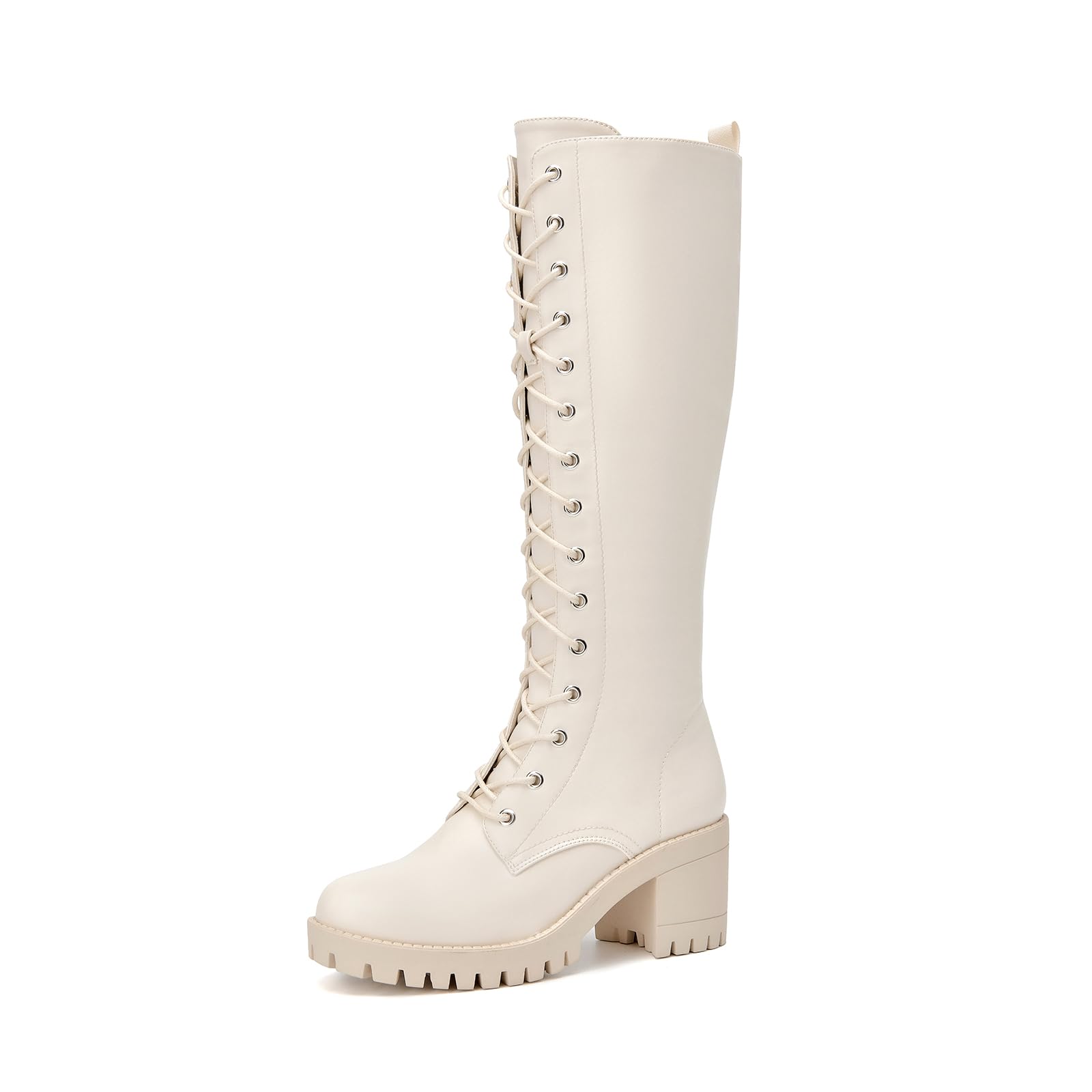Make a fashion statement in these stylish Chunky Lace Up Knee High Boots. With their sturdy leather construction. wide laces. and comfortable lining. these boots offer maximum comfort and style. The chunky sole provides extra cushioning and impact protection for long-term wear.