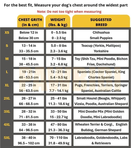 When picking your size. please measure your pet's chest girth and back length. You can use the weight and breed list as an estimate. but it does not guarantee a good fit.
