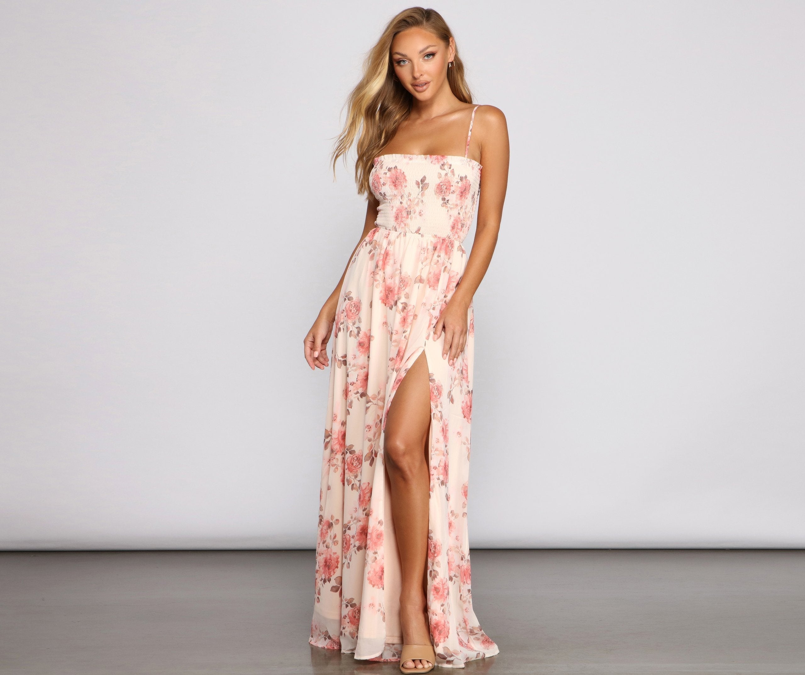 You will look effortlessly enchanting in this stunning floral maxi dress! It features adjustable spaghetti straps. a square neckline with a ruffled trim. a stretchy smocked bodice. and a lace-up back. The elastic-banded high waist flows out to a floor-length skirt with an A-line silhouette and a thigh-high slit. Complete the look with dainty earrings and cute wedges.