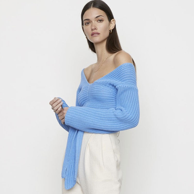 This sweater is all you want to create a feminine yet elevated look. It's an ideal versatile piece for this season. no matter the special occasion. whether you would like to dress it down for a casual day or dress it up for an exciting night out. Featuring a plunging neckline and a deep V-shaped skin-baring design to the back. the polyester-blend knit feels so soft to the touch and the long sleeve sweater also has a tying waist for accentuating the slim fit. Style it with a pair of casual white pants. or sultry fitted mini skirt. this sweater has the power to manifest its moment.