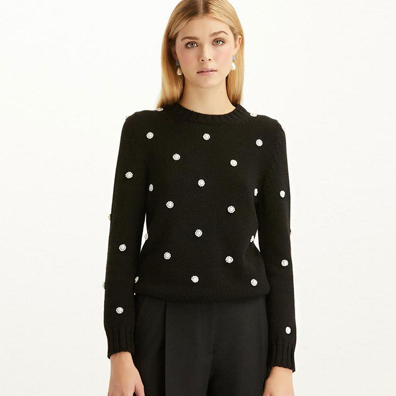 Intarsia-knitted with vivid dots for an elegant finishing touch. the mock-neck sweater is crafted with medium-weight knit fabric for a cozy feel. The white polka-dot pops against the black backdrop for added a truly vintage vibe. Cut in a relaxed silhouette for comfortable wearing. the pullover features ribbed trims and puffy sleeves that inspire you to embrace the romantic and whimsical side. Pair it with an A-line skirt for a simple and straight-forward lesson in a cozy elegant styling.