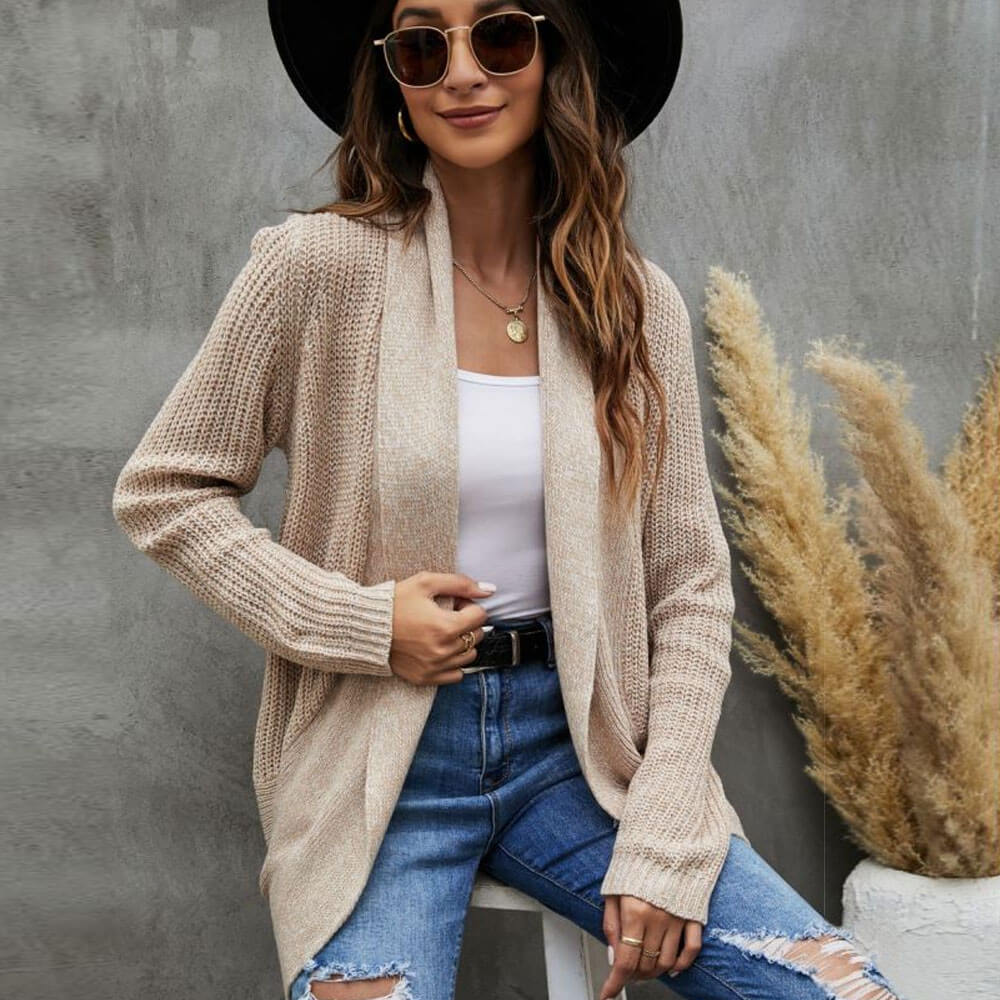 This is a transitional cardigan you have been searching for. The open-front piece takes a beautiful silhouette of a cocoon shape with a shawl collar elegantly draping to the front. Finished with a playful curved hem. the oatmeal-hued cardigan is marled knitted from refined acrylic yarns to create a unique heathered effect. We love the chunky stitching plus soft ribbing detail for added textured fun. Try a fitted midi dress and pumps for a winning look.
