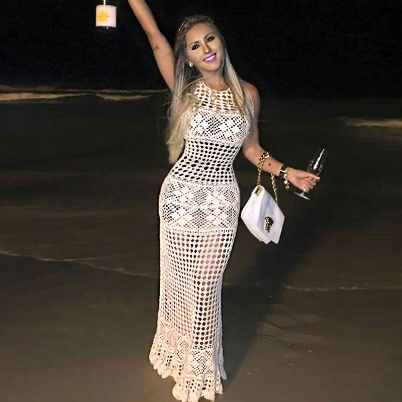 Add a pretty style to your beach look in this elegant cover-up dress - or take it as a layer-friendly basic to the street! This maxi open knit dress is crochet-knitted from soft acrylic in intricate geometric motifs �argyle patterns and pointelle detailing. and fits close through the tank bodice before flaring out to a sweeping fluid hem with a scalloped edge. Layer it over a tonal slip or your favorite bikini for coverage.
