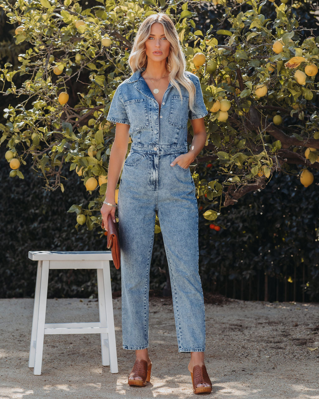 A structured feel makes the Emery Cotton Pocketed Denim Jumpsuit in classic denim blue a flattering and trendy outfit.