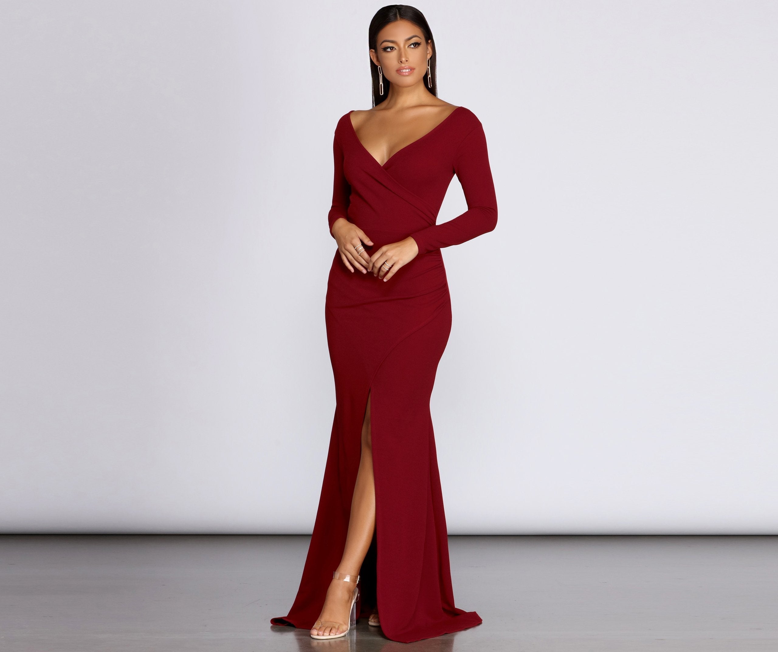 Make it an entrance to remember in our stunningly chic Eva mermaid dress. She features an off the shoulder neckline with long fitted sleeves. a wrap front V neckline. a high waist seam. ruched side detailing. and a fitted and flowy mermaidsilhouette with a thigh high front slit. The dress is composed of a crepe fabric that offers moderate stretch.