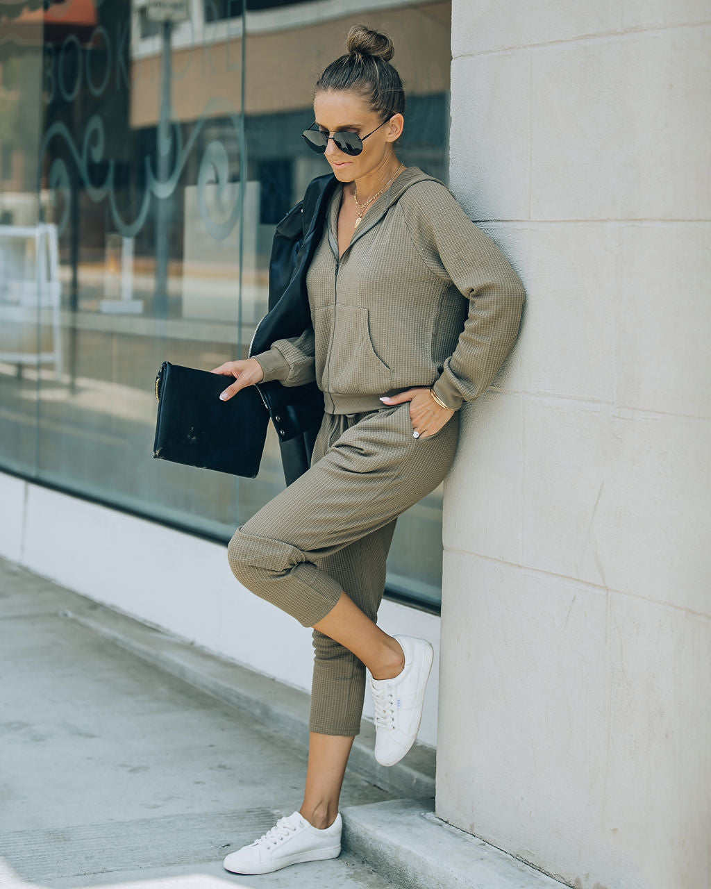 Styled with: Stella Clutch. Gramercy Jacket. Every Waffle Joggers. and Common Thread Sneaker.