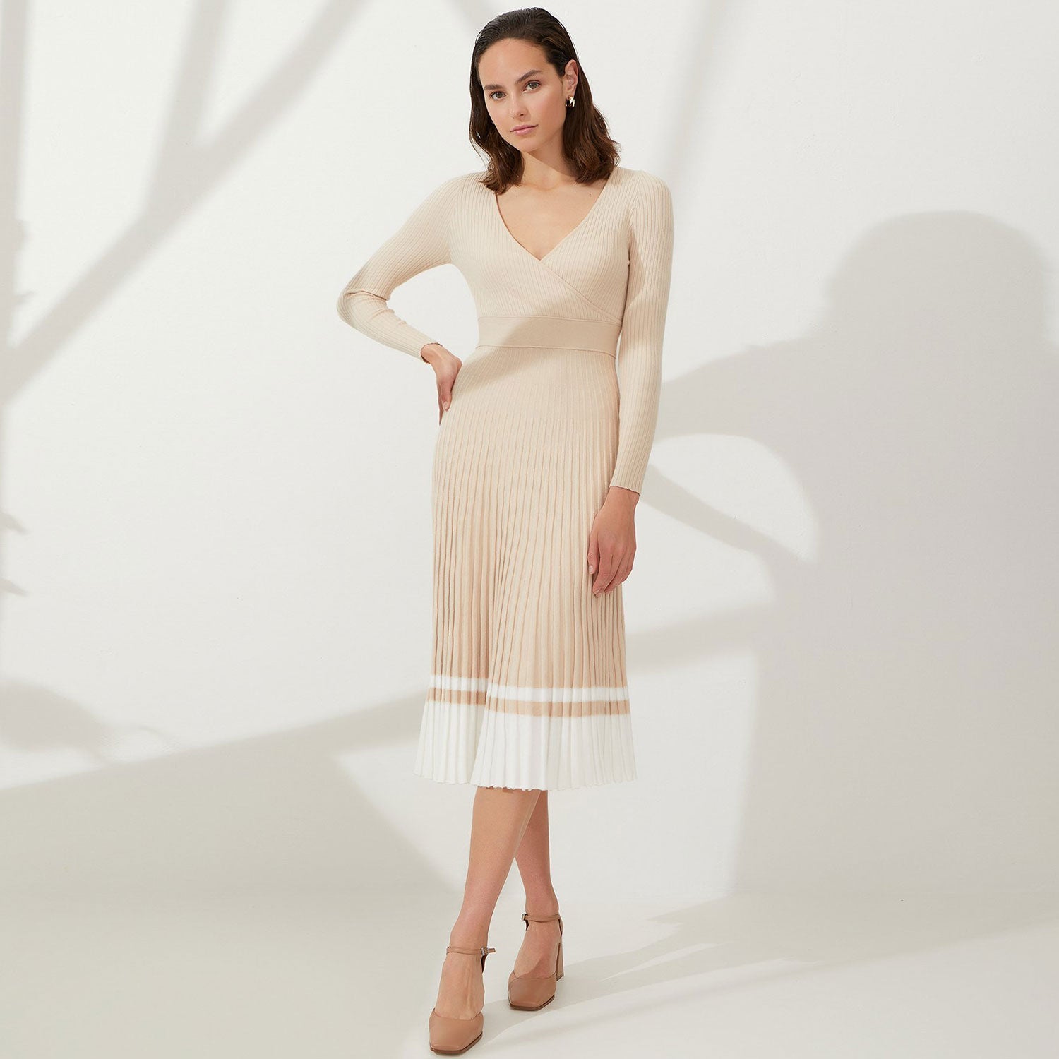 Flowy and flirty. our pretty sweater dress is the epitome of effortless elegance. This midi dress features a graceful wrapped V-neckline and a flattering fit and flare silhouette that flows beautifully with your every move. The pleated detailing adds a touch of sophistication. making it perfect for special occasions or romantic outings. With its contrast striped detail at the hem. it exudes a trendy and eye-catching appeal. Crafted from rib knit fabric. it ensures both comfort and a figure-flattering fit. Embrace the flowy charm of this midi dress and elevate your fashion game with a stylish and versatile choice. Whether you're attending a summer soiree or a daytime event. this knitted dress will make you feel like a true fashionista with its chic and flattering look.