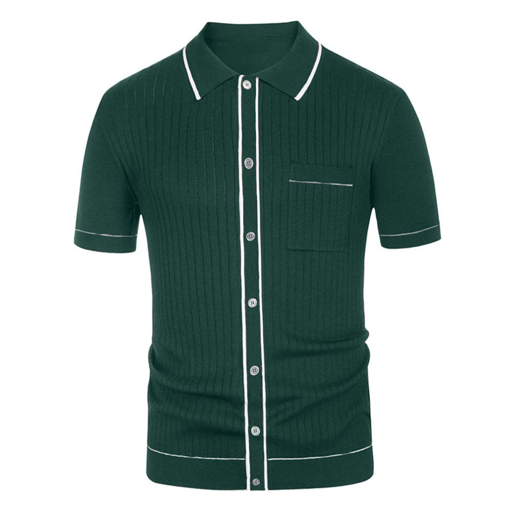 You have more than one choice other than T-shirt in summer. This men's knitted shirt will be your favorite this summer. We reimagined the knitwear with fold-over collar details and contrast tipping to create this viscose-blend knit for men like you. A wide. ribbed-knit stitch and chest pocket detail add retro classic appeal to this piece. The button-front style in this regular-fitting silhouette makes this cardigan jumper easy to wear and fits perfect for most of the occasions in summer. like golf business. coffee errands. Pair it with suit pants and loafers for a classic men summer fashion look.