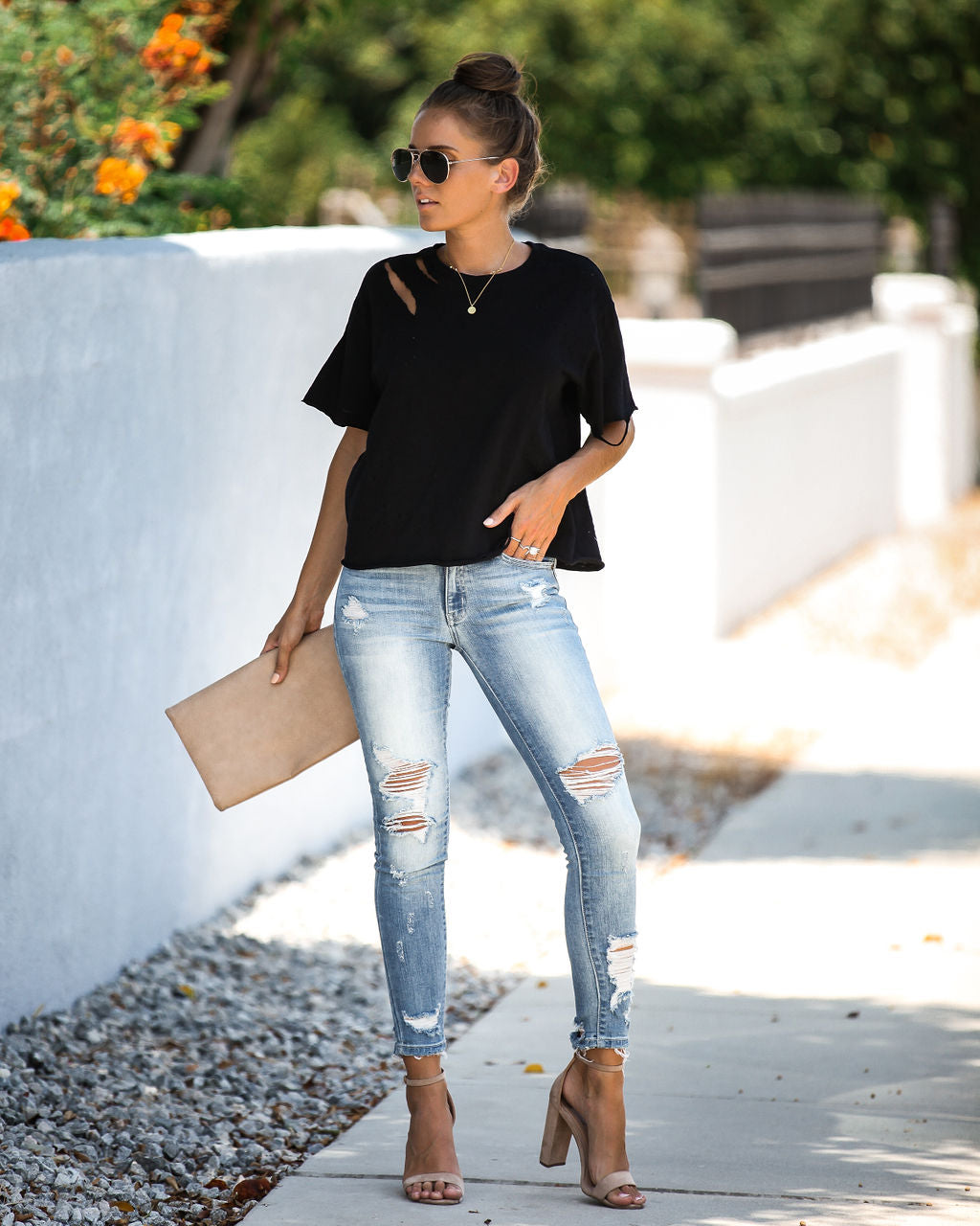 It's no joke with the Game On Cotton Distressed Tee! We've got a lightweight. heathered black tee that sports a relaxed fit and semi cropped length. Cut with a crew neckline and short sleeves and moderate distressing! Finished with an unfinished hemline and sleeve hems to achieve the ultimate look. An edgy basic to style for summer + pre-fall! Styled with the Chloe Mini Necklace. Bali Necklace. Austin Distressed Skinny. Make A Scene Heels and Stella Crossbody Envelope Zip Clutch.