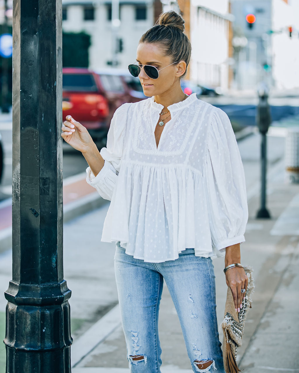 Turn up the femme in our Harraz Cotton Swiss Dot Babydoll Top! This white top features a split neckline and sleeves. Designed with a hook eye and clasp closure. Finished with a billowy fit. Styled with the McGuire High Rise Distressed Denim. Blair Faux Suede Strappy Heeled Sandal. Shashi Leela Clutch. Chloe Mini Necklace. Compass Coin Necklace and Simple Bangle Bracelets.