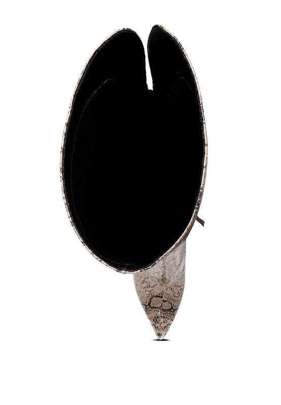 Wearing these stunning long heel boots with a snake print will make you stand out from the crowd. The all-over pattern is striking and distinctive. the heels will boost your confidence and the side zipper opening makes it easy to wear.