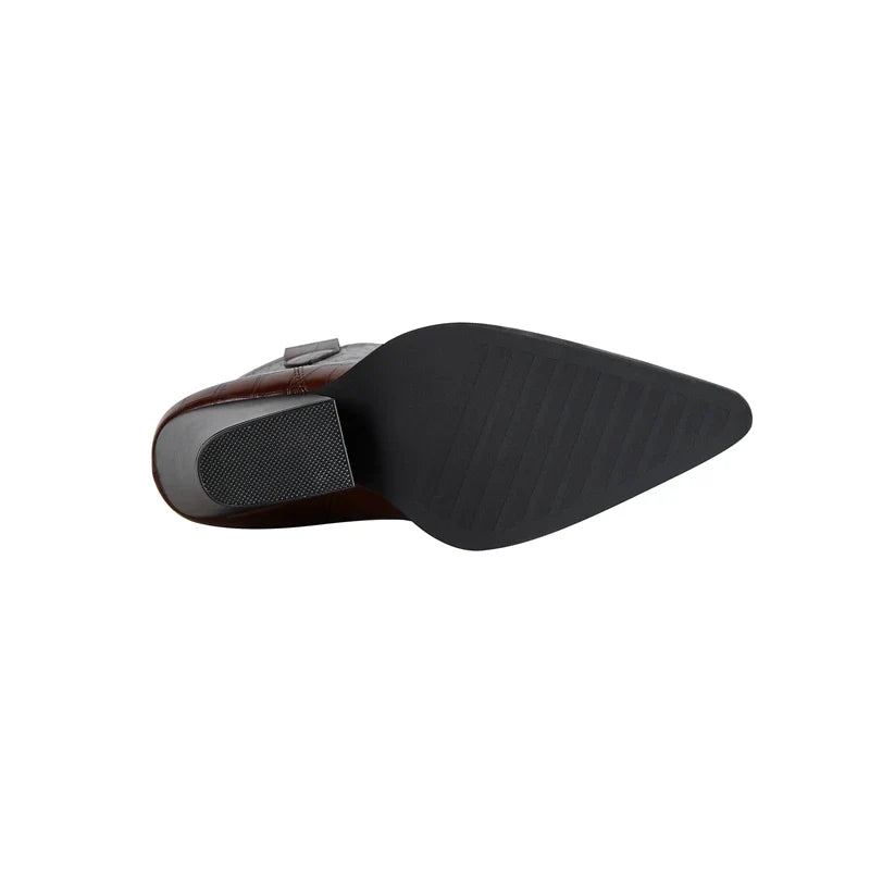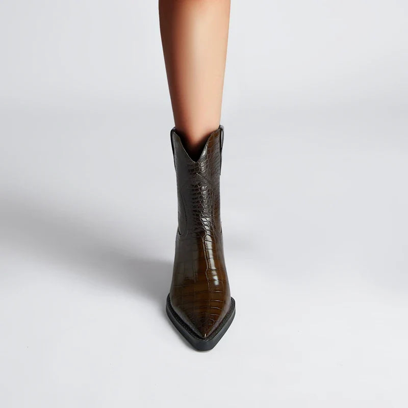 Revamp your wardrobe with the Kayla Croco Pattern Western Chelsea Boots. These boots offer a chic and trendy croco pattern. ideal for incorporating a hint of edginess into any ensemble. The enhanced Western aesthetic with refined accents and geometric heels adds a distinctive touch. Add these beautiful boots to your collection today.