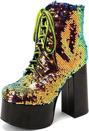 Lace Up Glitter Sequin 14 Gold/Green Combat Boots